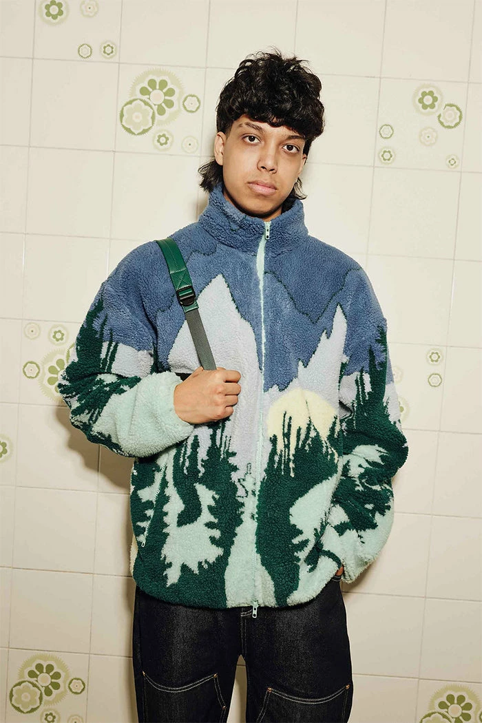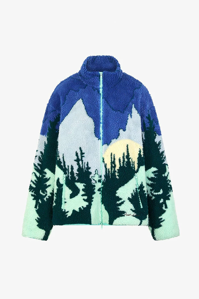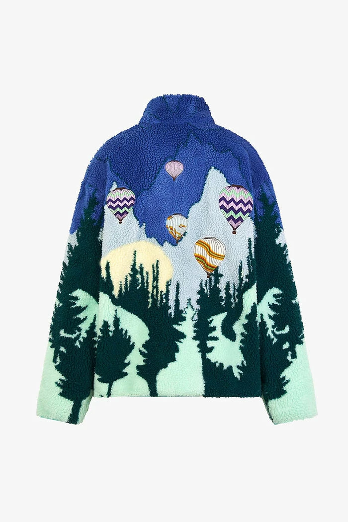 House of Sunny Mountains Should Be Climbed fleece teddy zip jacket. This loosely fitted colorful teddy is crafted from a soft fleece material. Aptly dyed using an environmentally-protective method, it’s home to a wild landscape with hot air balloons embroidered on the back. It’s equipped with zipped pockets, a zip closure and a mesh lining featuring an inner pocket.