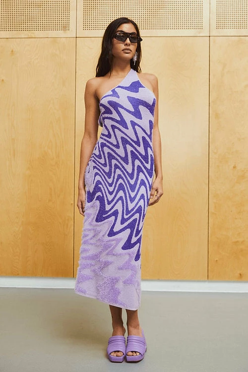 House of Sunny Wannabe one shoulder knit hockney dress. Asymmetrical single-shoulder strap, alongside a familiar slip-like fit and midi length. It boasts a dramatic cut-out at the back, held in place by a spaghetti strap embellished with four pearly beads. Distinguished by a purple wavy print that alternates between a smooth and fluffy touch.