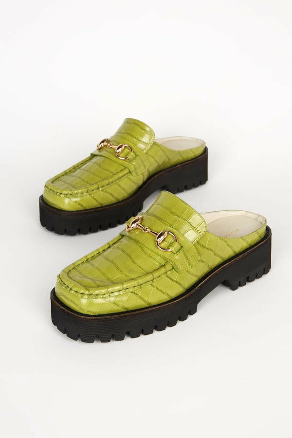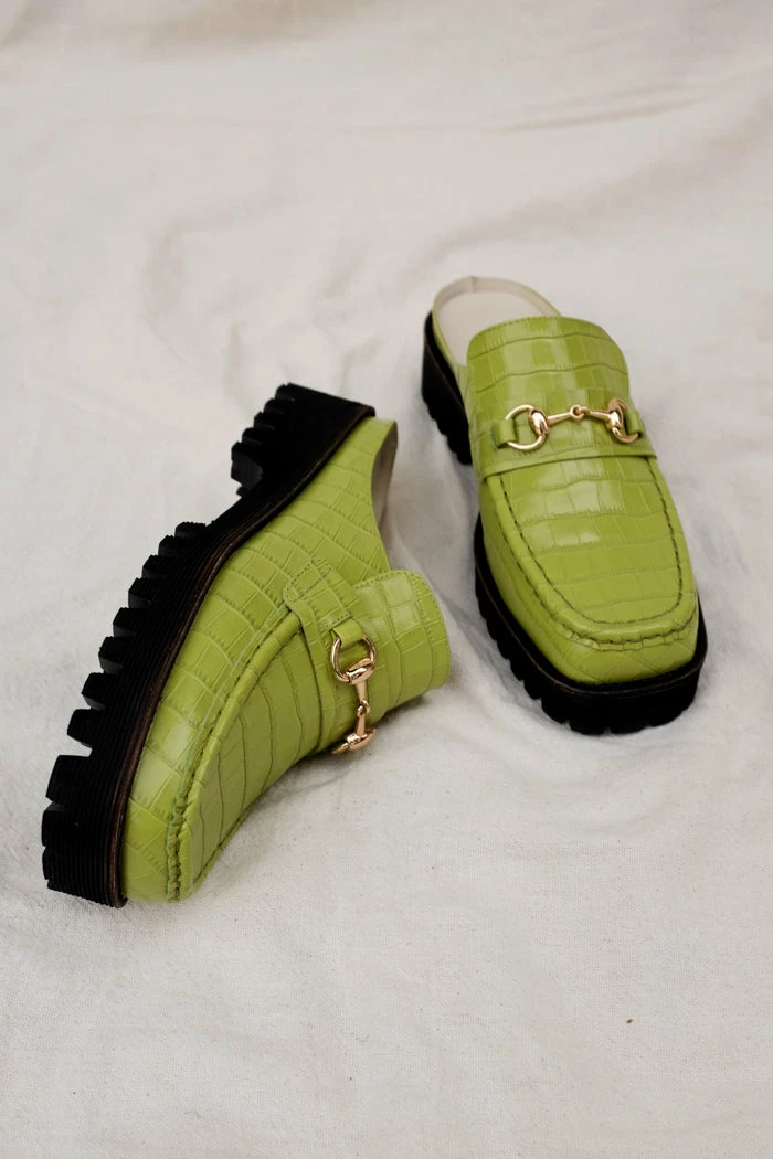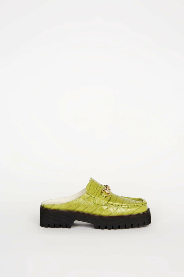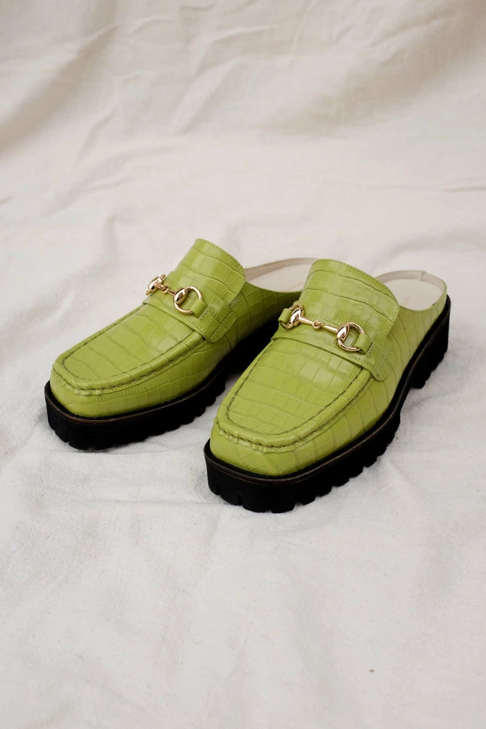 Intentionally Blank Kowloon muled loafer in green apple croc. The open back version of the HK oxford. The treaded sole is an Eva base that provides extra comfort and fit. A thin brown leather welting detail lines the outsole of the shoe for a nod to menswear trends. Welt detail is hand finished so some variation in appearance is normal and should not be considered a defect.