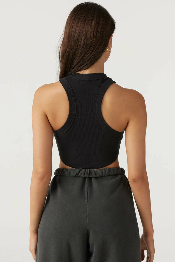 Joah Brown crop rib body tank in black. Featuring an exaggerated high crew neckline and curved hem.