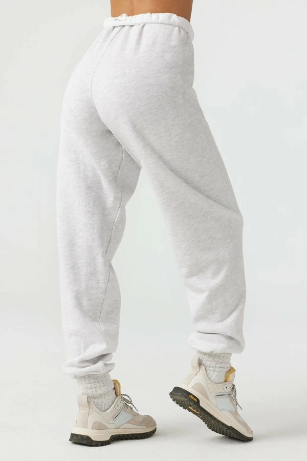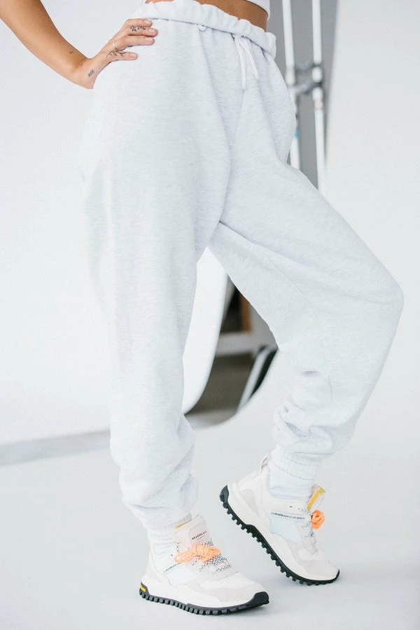 Joah Brown oversized jogger sweatpants with an elastic waistband and gathered ankle cuffs in pearl grey. Adjustable hidden drawstring at waist. Brushed mid-weight cotton, comfortable and made to last.