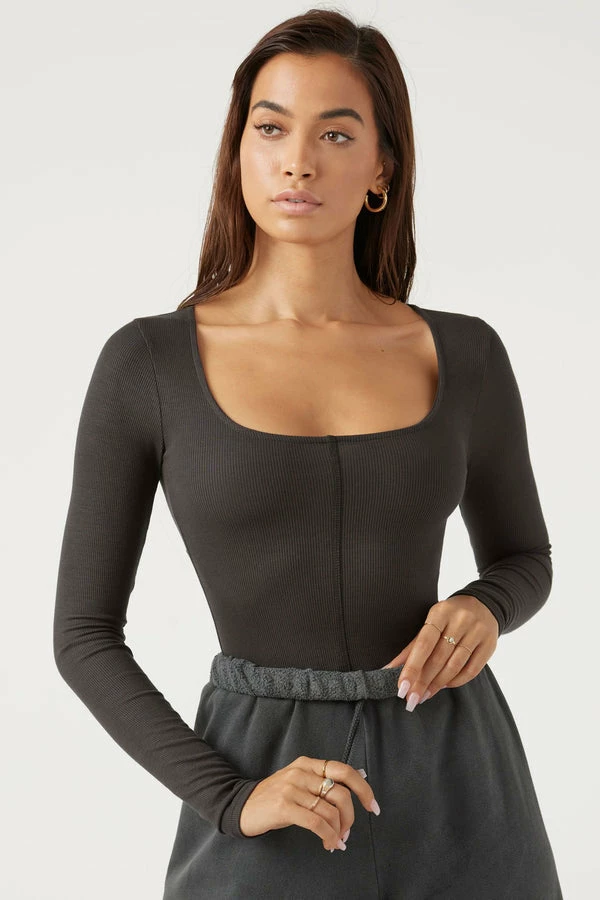 Joah Brown classic scoop long sleeve ribbed top in vintage black.Â