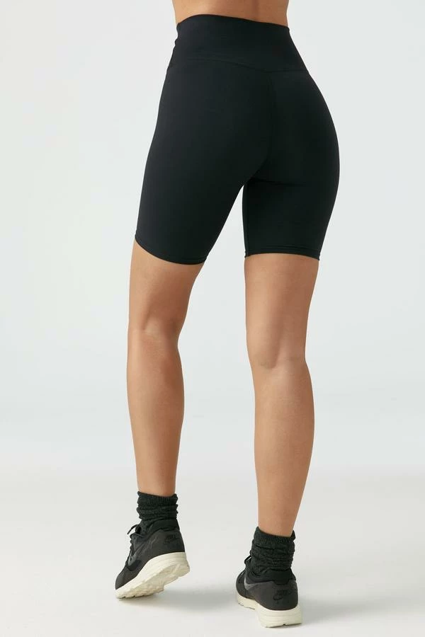 Joah Brown high rise biker short in sueded onyx. Wide waistband to slim and contour. Hits at mid thigh.Â