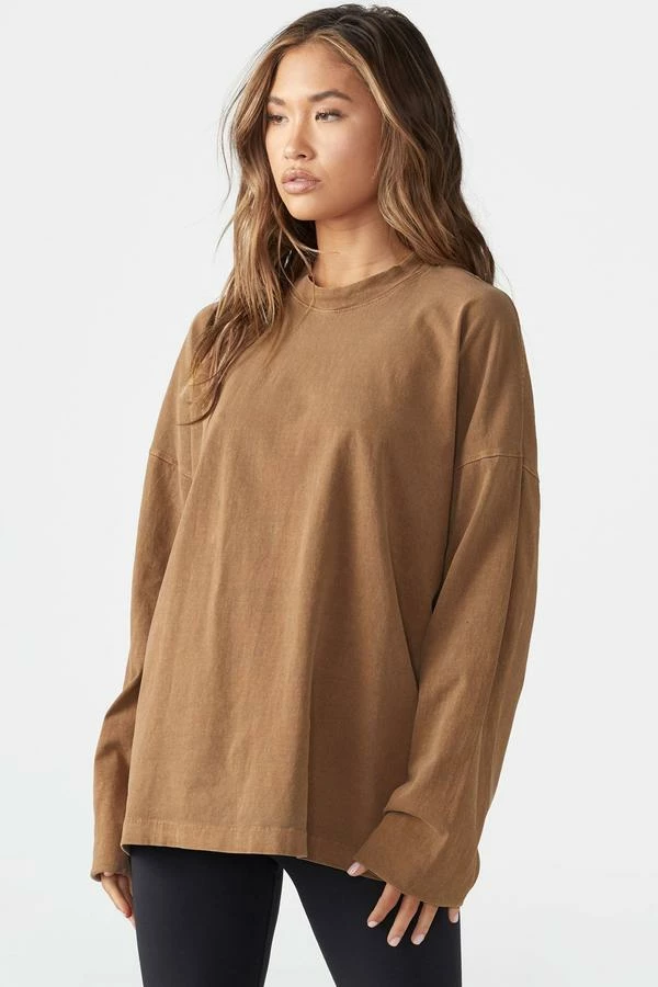 Joah Brown toast brown vintage long sleeve crew neck tee, with oversized fit and ribbed accents. In a heavyweight cotton fabric, it gets better with every wash.