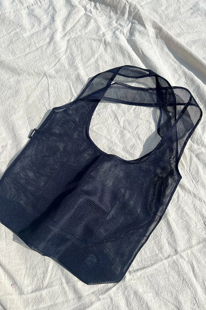 June’s everyday mesh tote in bio-knit deep navy blue. The Everyday Tote is good for any kind of day – from work and errands to beach and travel. Made in the U.S., our poly mesh is uniquely designed to hold the heaviest of loads. Inside all Everydays you’ll find two deep pockets for your wallet, phone, keys, and essentials. Folds up small for stashing and stowing.