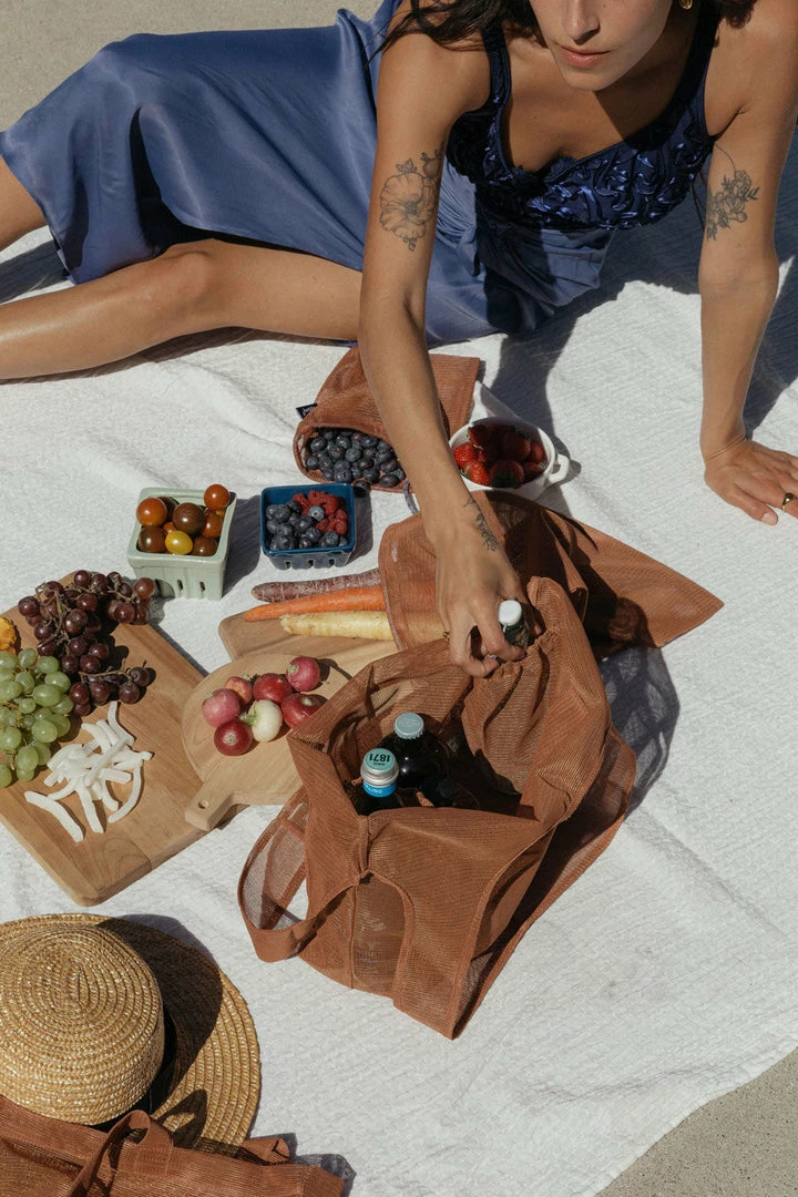 June’s everyday mesh tote in bio-knit terracotta. The Everyday Tote is good for any kind of day – from work and errands to beach and travel. Made in the U.S., our poly mesh is uniquely designed to hold the heaviest of loads. Inside all Everydays you’ll find two deep pockets for your wallet, phone, keys, and essentials. Folds up small for stashing and stowing.