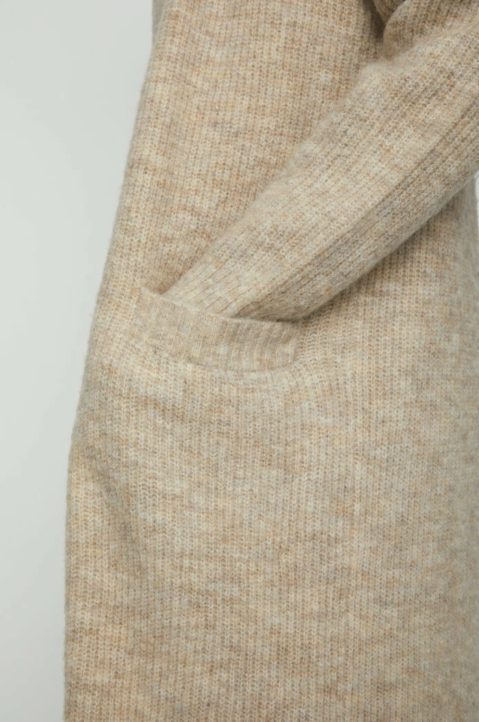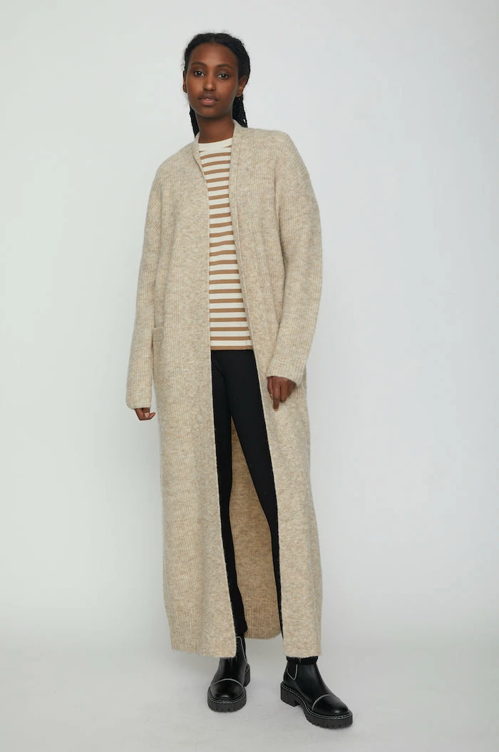 Just Allow maxi long knit cardigan in nomad tan. Made from a super soft mohair, wool, polyester, and elasthane blend. This show stopping cardigan is open and features ribbed trims around the cuffs, bottom and two front pockets. A great extra layer on colder days with a dramatic flair.
