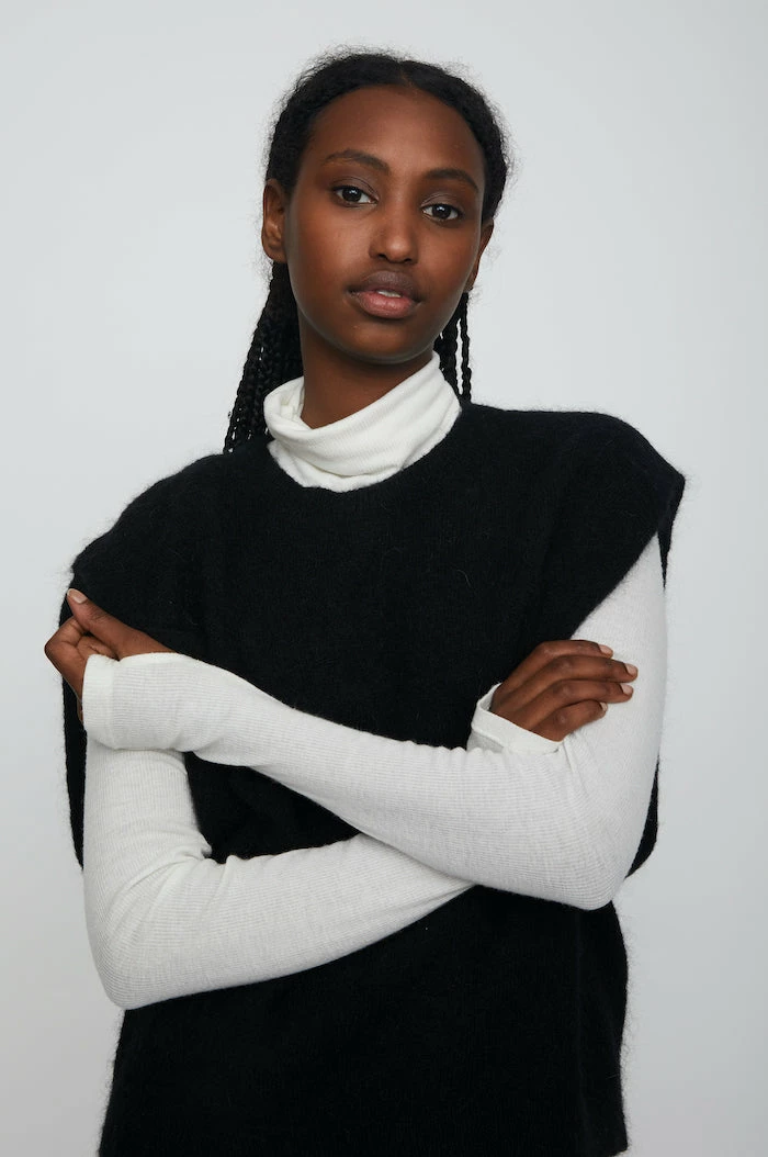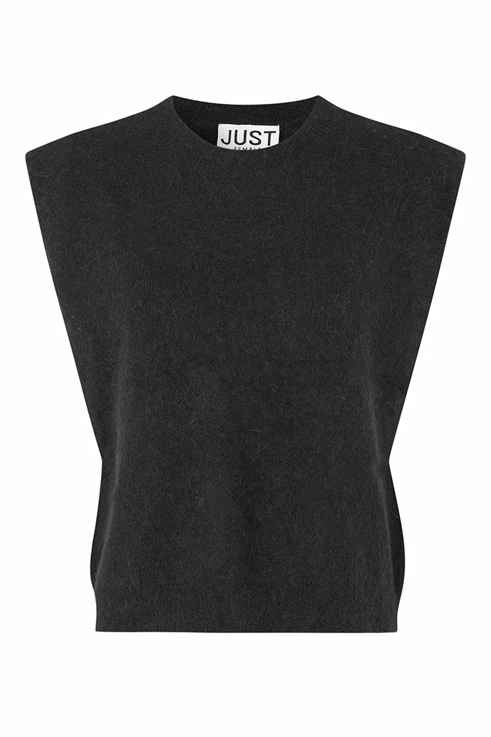 Just Female Coldy knit vest in black. Warm and soft knitted vest made from a certified mohair blend. The vest has a round neck with rib, defined shoulders, and is slightly oversized. Style it over anything from blouses to shirts and dresses on colder days.