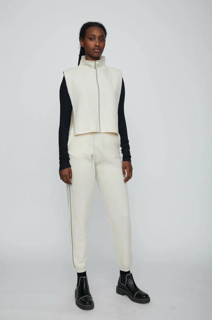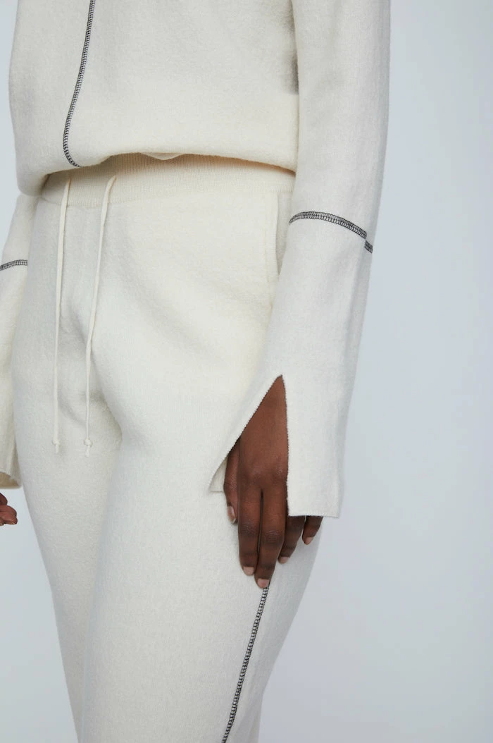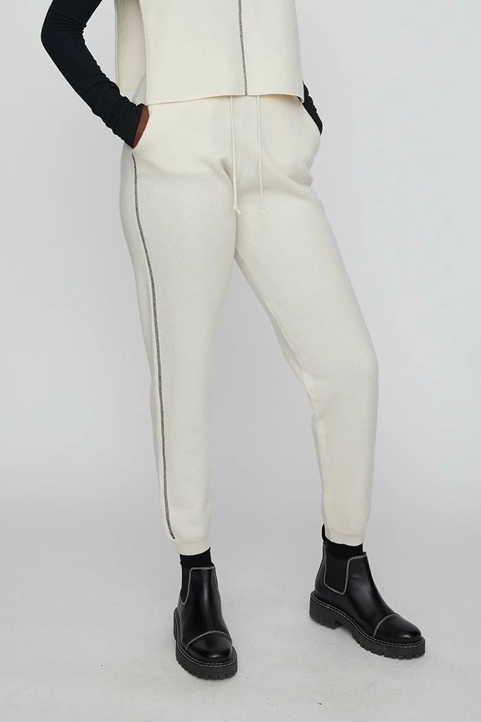 Just Fair knit jogger wool pants. They have a ribbed elastic waist with tie strings, side pockets, contrasting stitching along each side and ribbed trim at the bottom. Pair with matching Fair Knit Blouse.