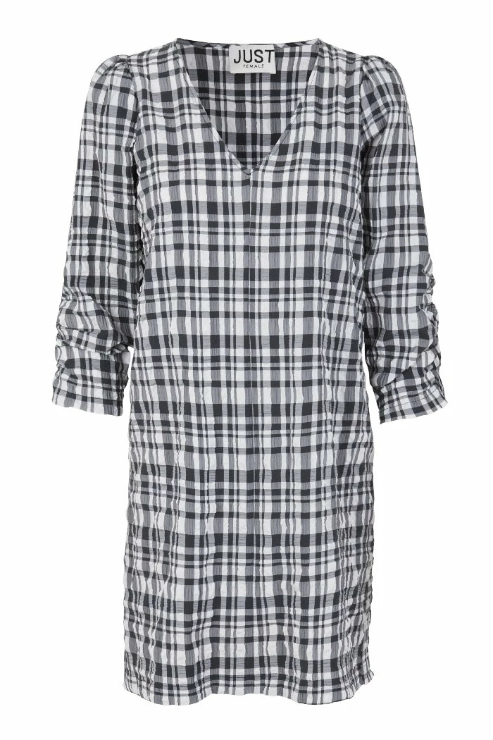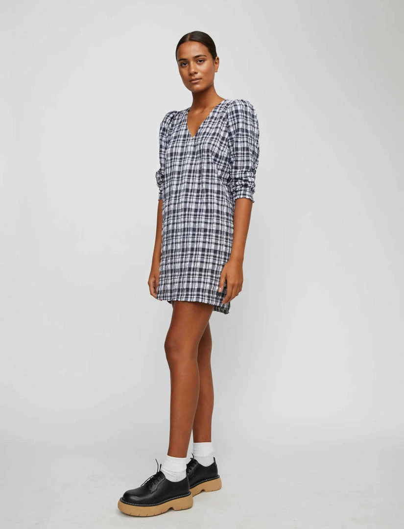 Just Female plaid gingham Hamilton V neck mini dress in lightweight, textured, crinkle fabric.