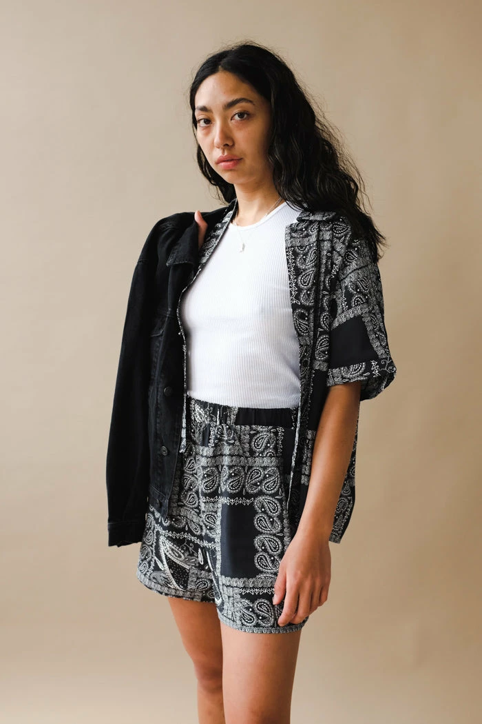 Just Female lightweight black Maid shorts in all over white paisley print. They have an elastic waist and side pockets. Style them with the Maid Shirt for a cool and casual full look.