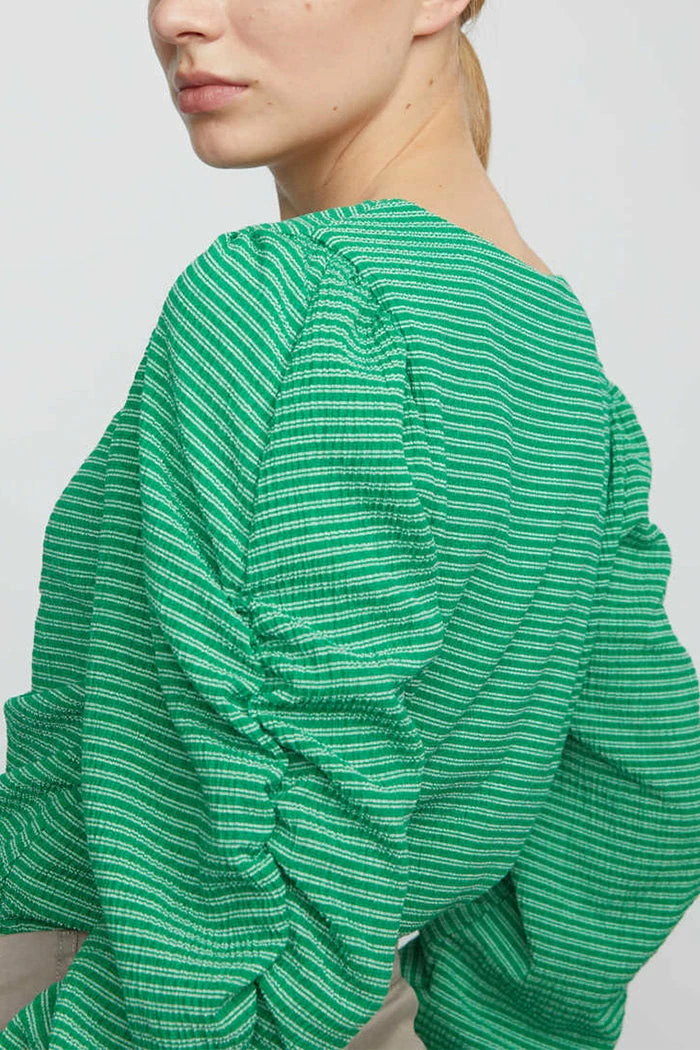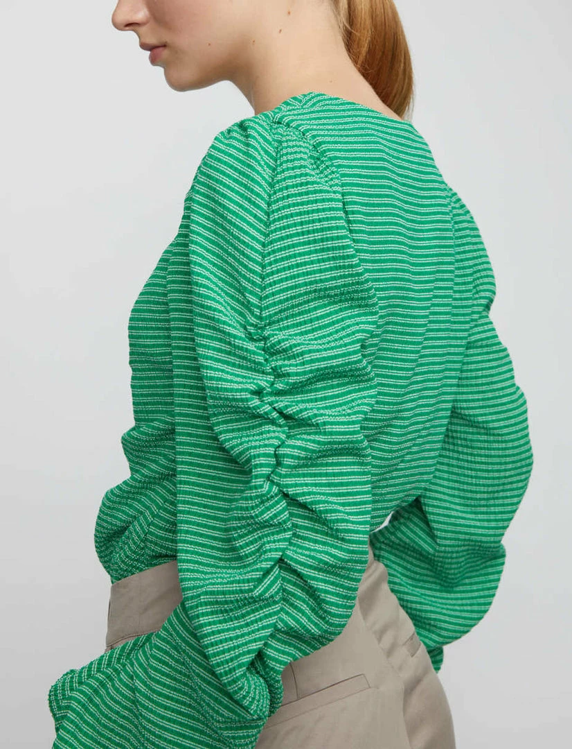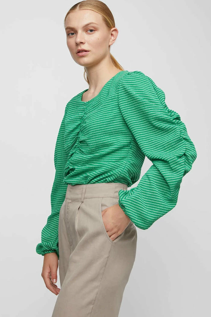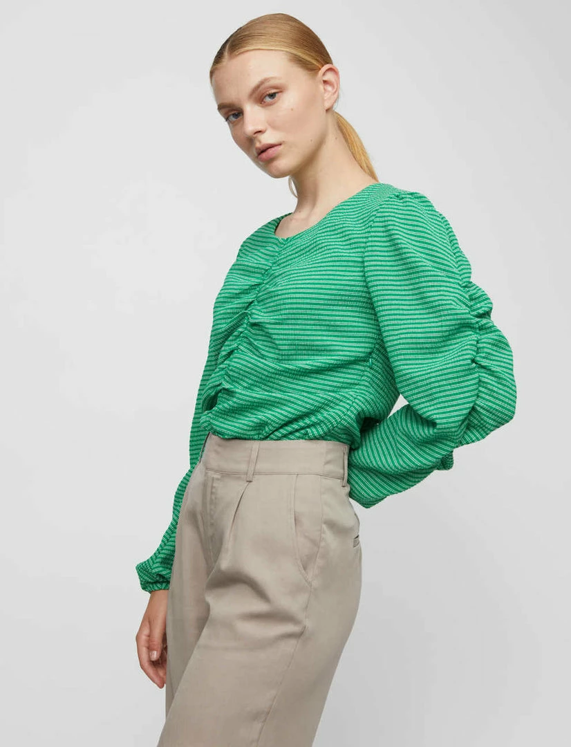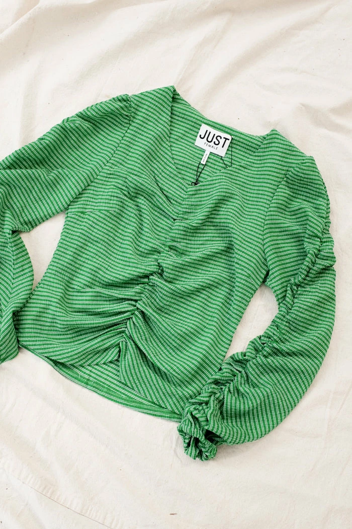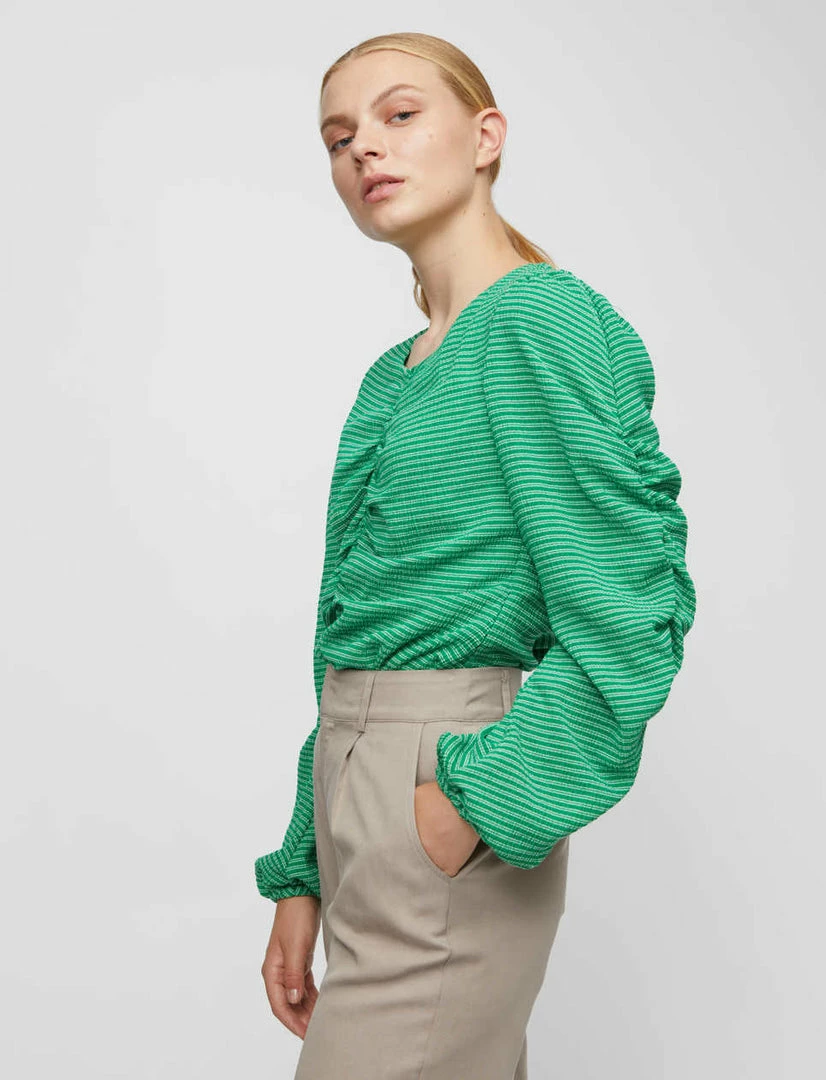 Just Female Mimi ruched green blouse top with white stripes.Â