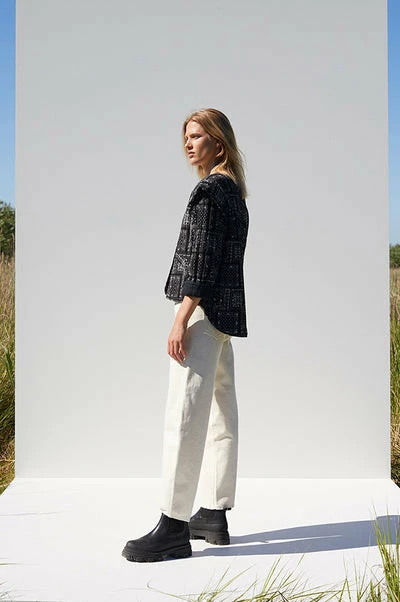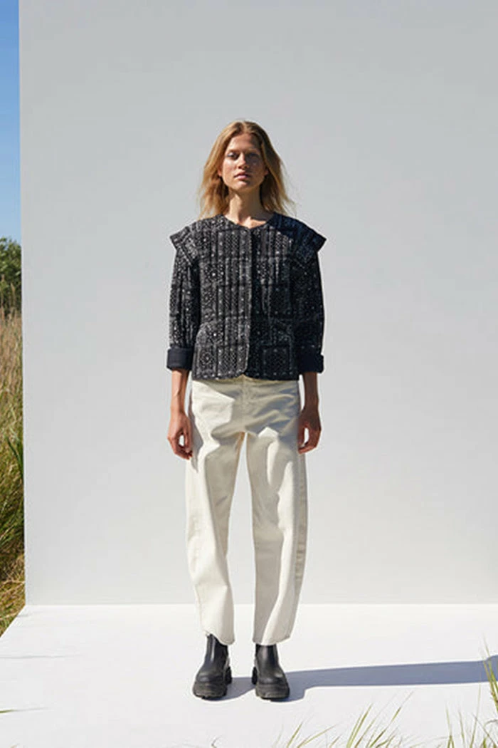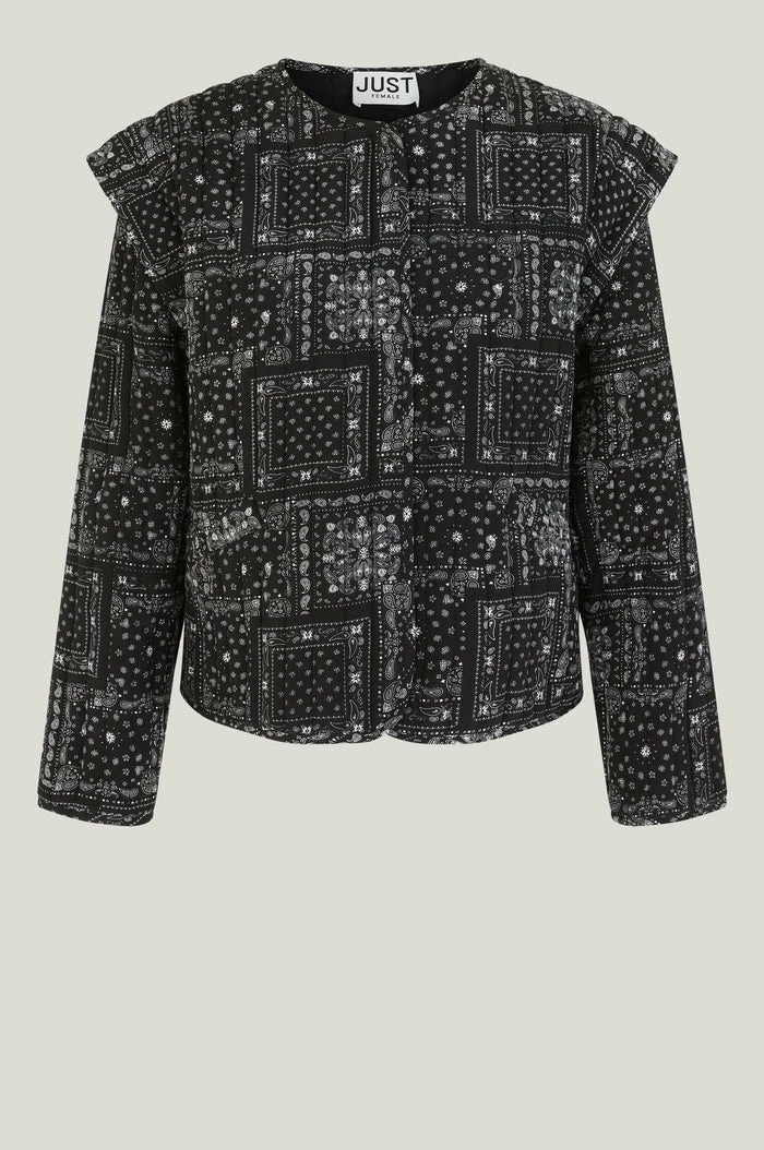 Just Female quilted padded Miracle jacket in black paisley print. This statement making coatΒ has a hidden button closing and cool accentuating shoulder details.