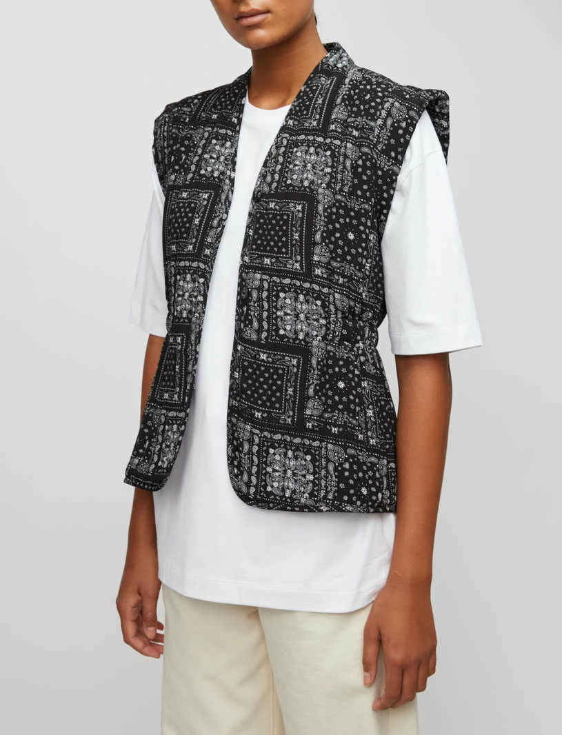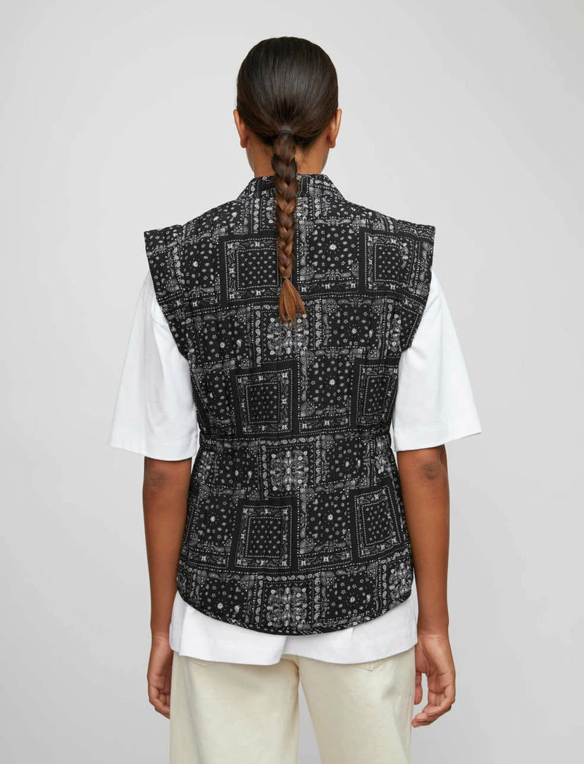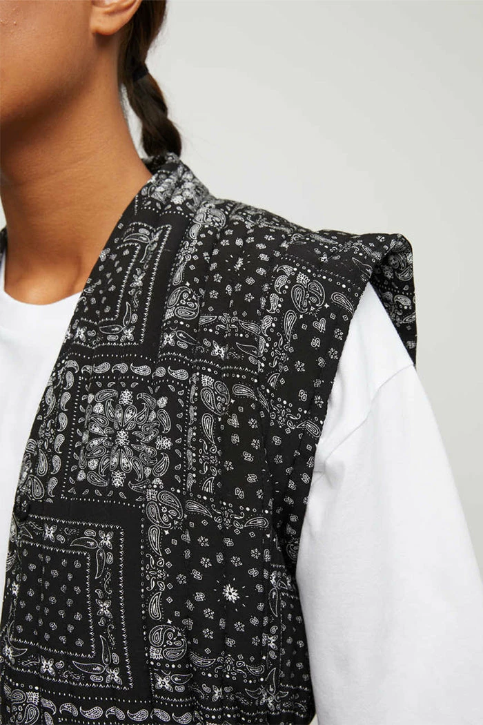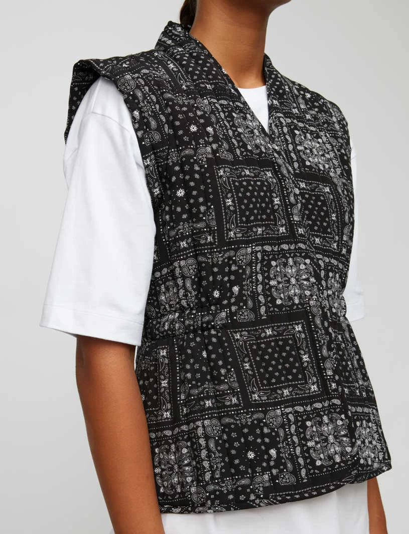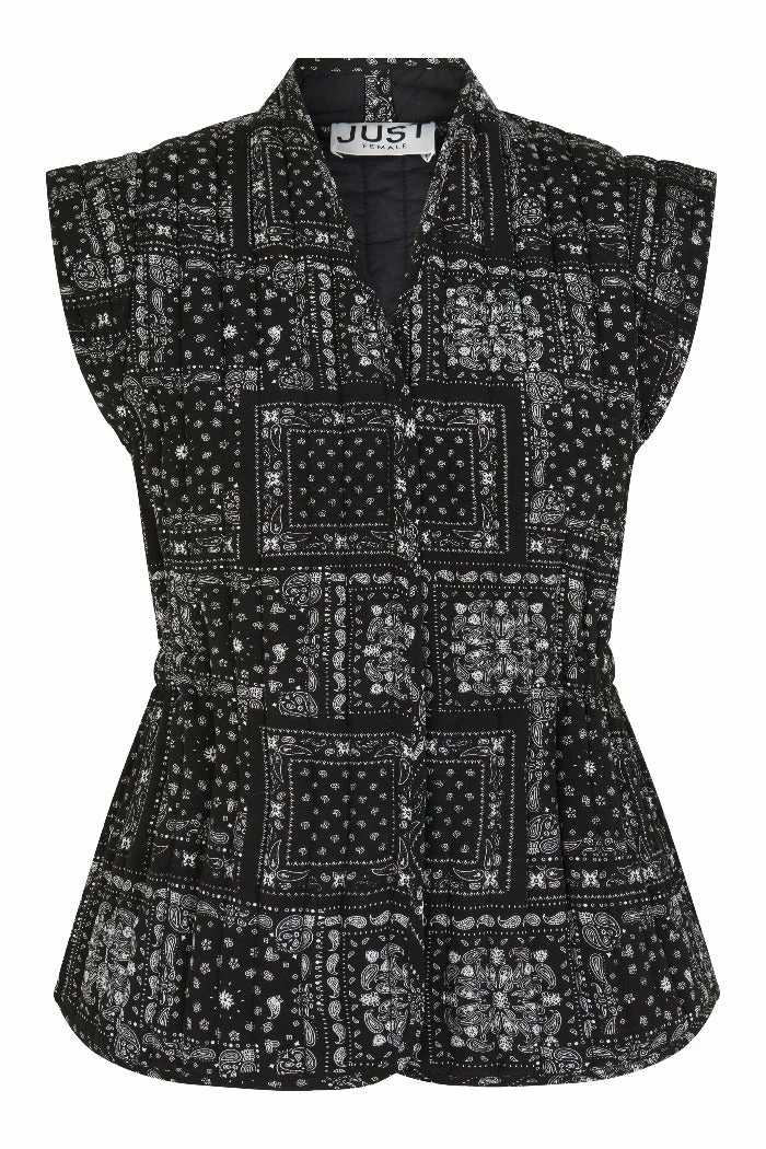 Just Female quilted padded Miracle vest in black paisley print. This statement making vest has a hidden button closing and cool accentuating shoulder details.