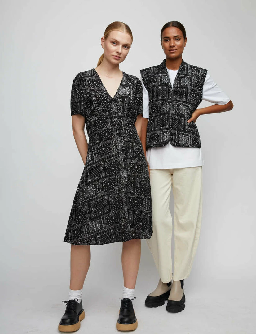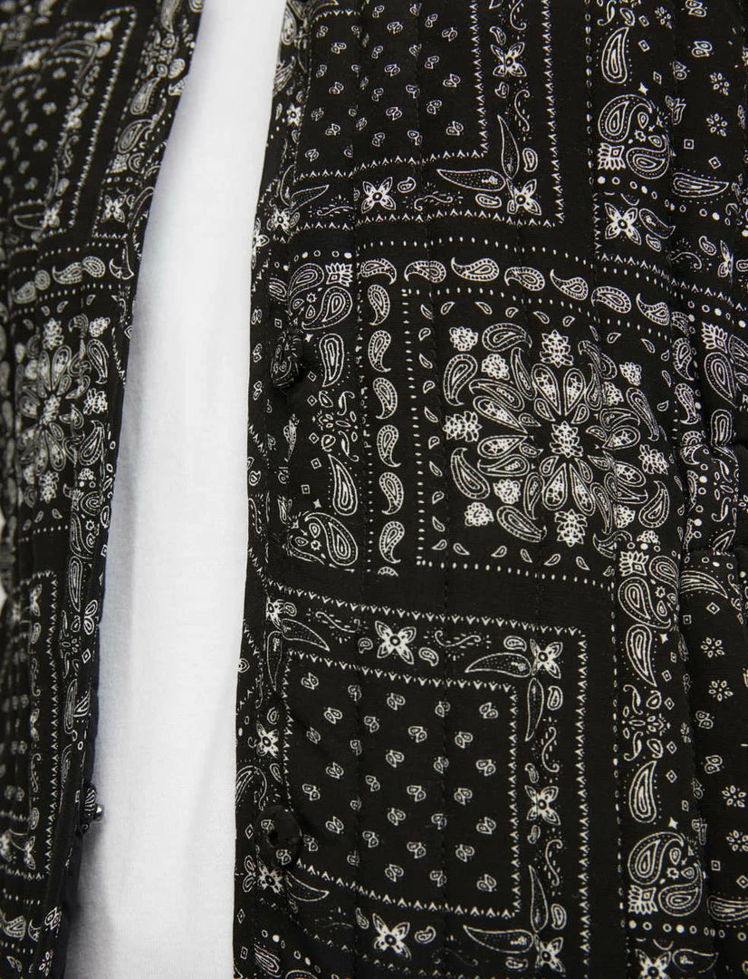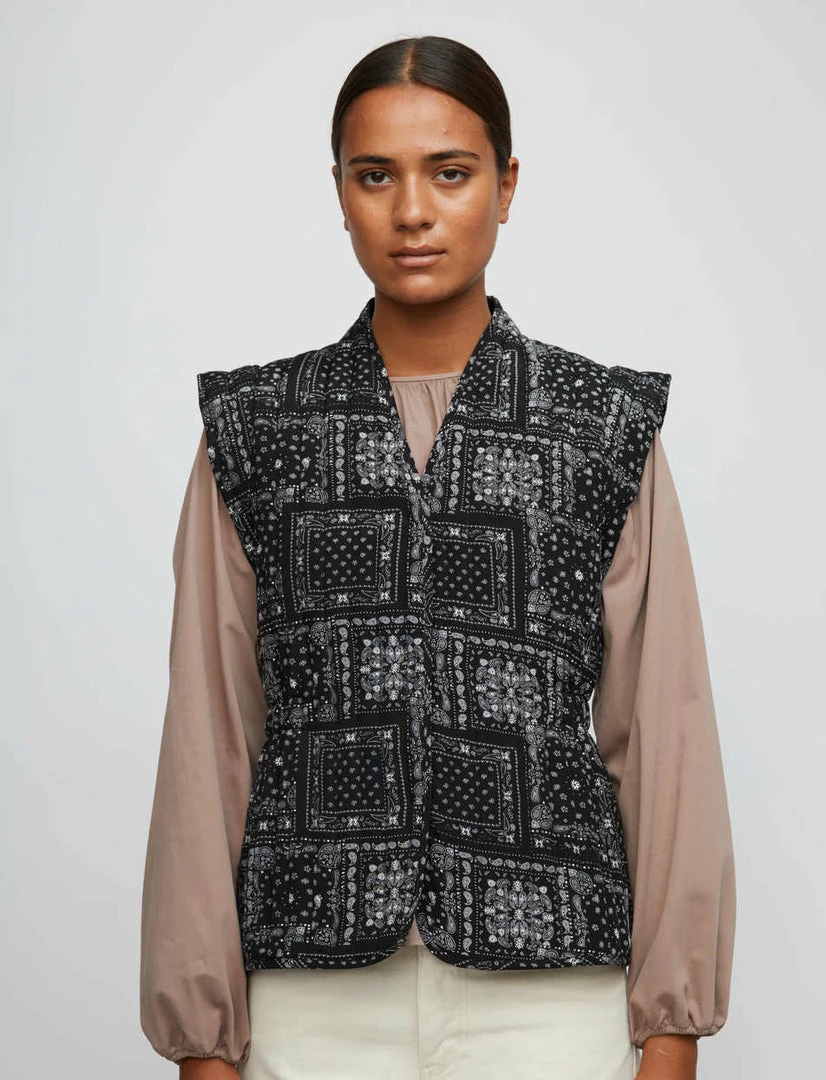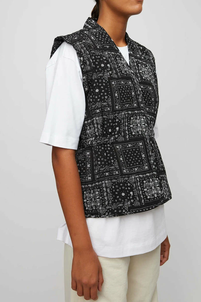 Just Female quilted padded Miracle vest in black paisley print. This statement making vest has a hidden button closing and cool accentuating shoulder details.