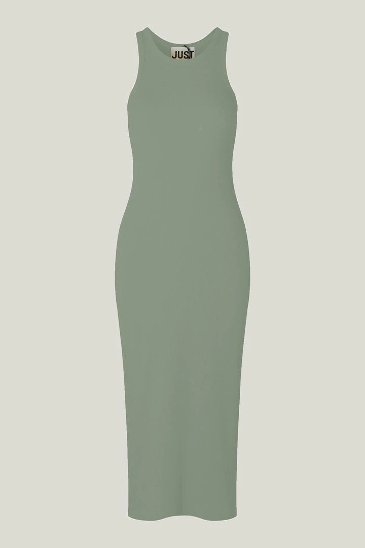 Just Rancho fitted soft rib, high neck, tank midi dress in sea spray green Racerback, and slits in both sides on the bottom of the dress.