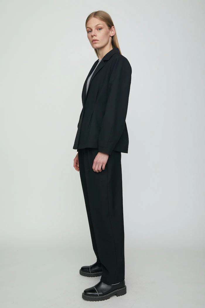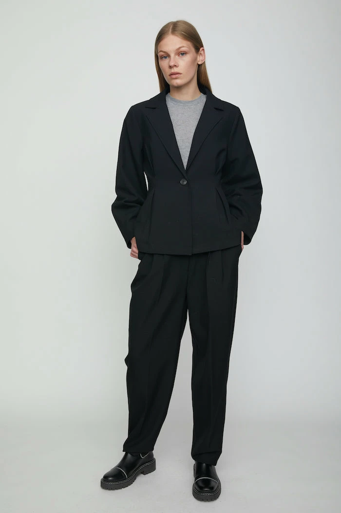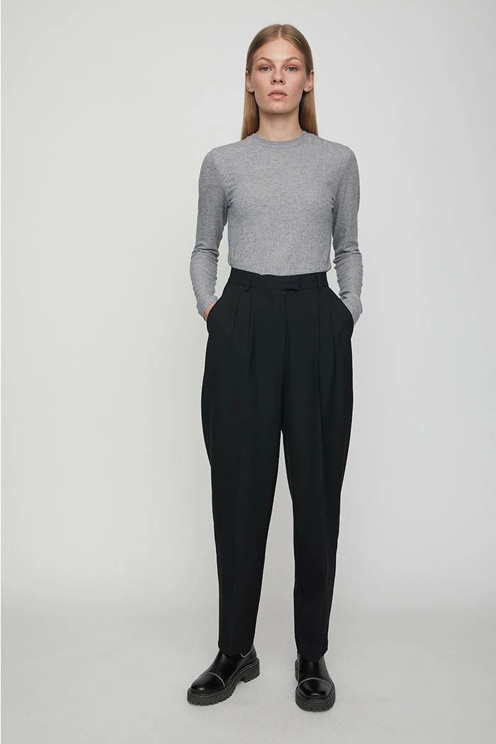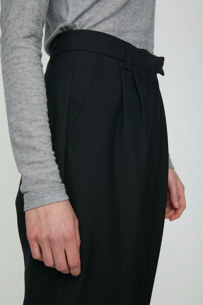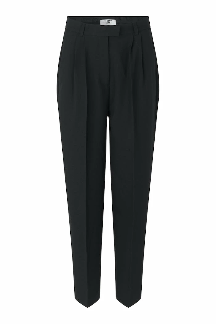 Just South trousers formal high-waisted trousers made from a warm polyester and wool blend. They have a fixed waistband with belt hoops, pleats, side pockets, fake back pockets, and straight pantlegs.Â