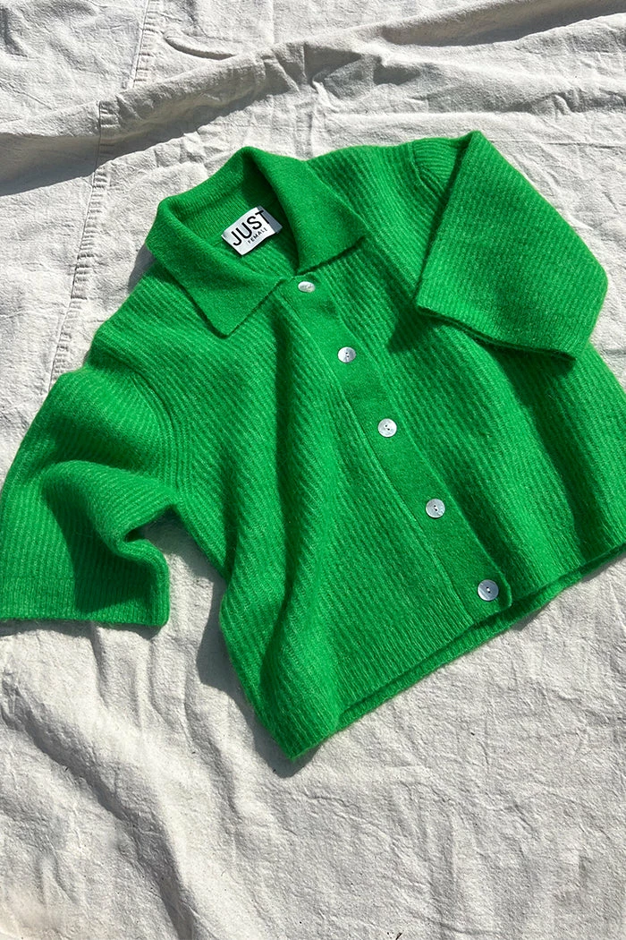 Just Female Rebelo short sleeve cardigan sweater in vibrant fern green.