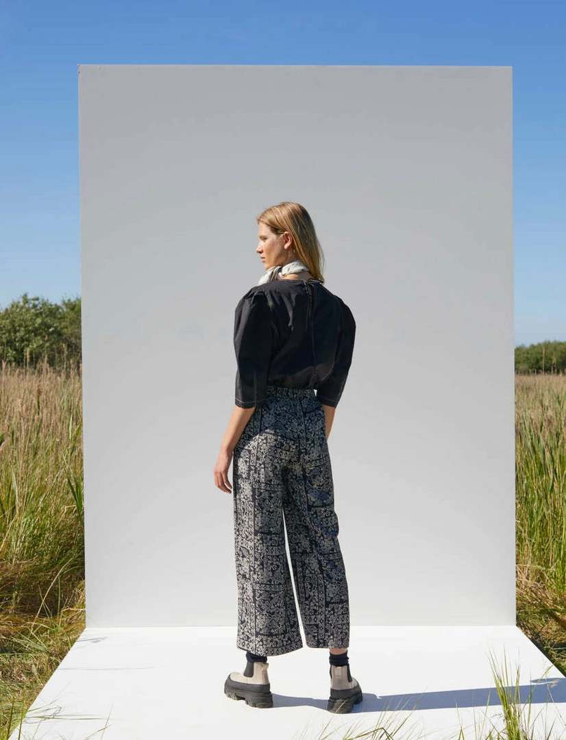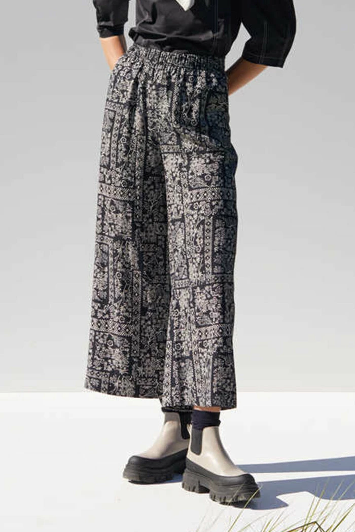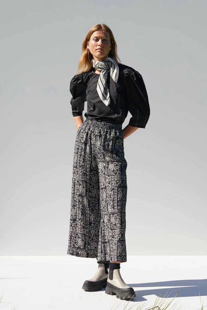 Just Female black paisley printed flowy Strong pants. Comfortable, high-waisted trousers with an elastic waist, straight legs, and side pockets.