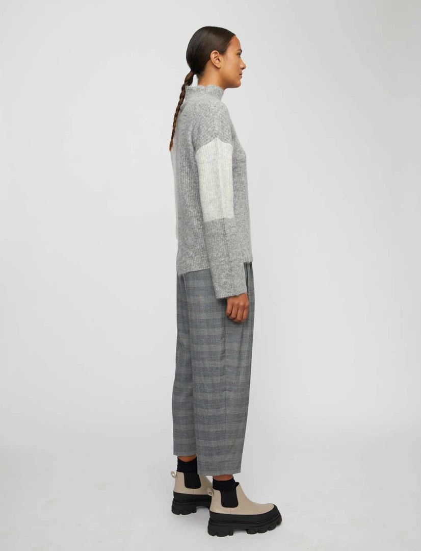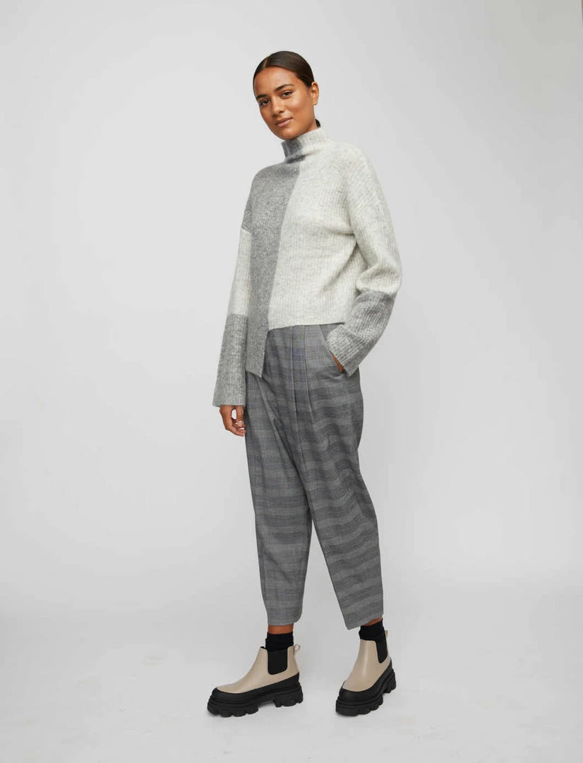 Just Female Value trousers in checkered grey. Formal high-waisted, carrot shaped trousers. They have a fixed waistband, pleats, side pockets, fake back pocket, and a fit that is loose at the hips and tighter around the ankles. The checkers are black and white with blue details.