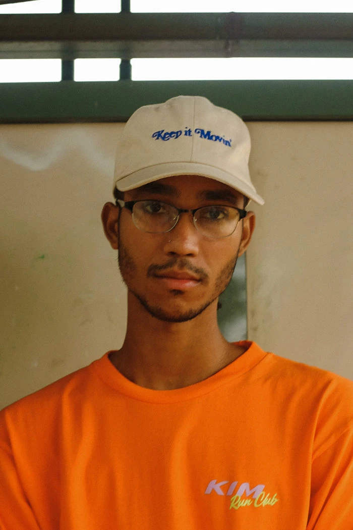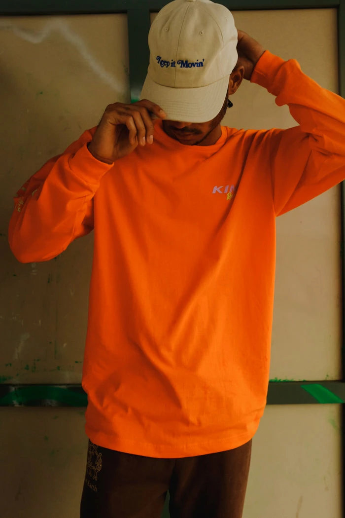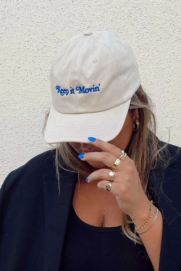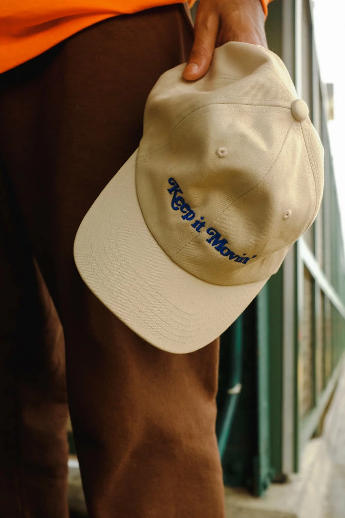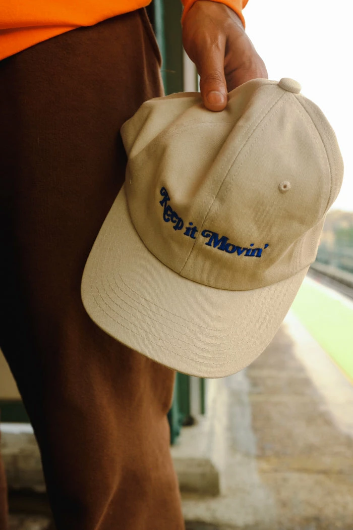 Keep it Movin’ glyph royal blue embroidered on khaki hat.Â