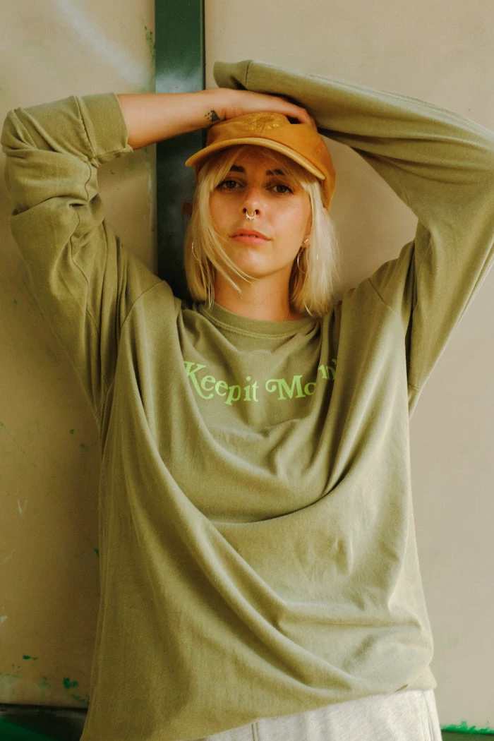Keep it Movin’ stampede super soft long sleeve tee in taupe. Stampede runners printed in purple along back hem, and ‘Keep it Movin’ printed across the chest in light green.