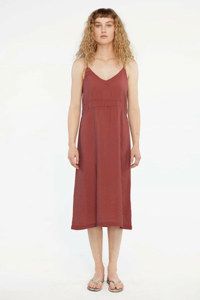 Lacausa Alma Slip Dress is a lightweight spaghetti strap slip dress in cocoa. Loose fit with v neckline. Crafted with crinkled fabric that makes the Alma great for layering or worn on its own. Complete the look with mules and oversized handbag.