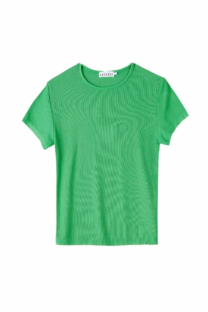 Lacausa Quincy ribbed baby tee in green apple. A fitted baby tee made from luxe 2×1 rib with a touch of spandex to for a snug, supportive fit! Siro spun micro modal is a semi-synthetic, plant-based fiber that is silky smooth to the touch.