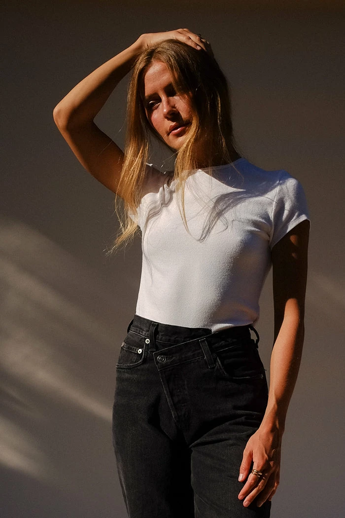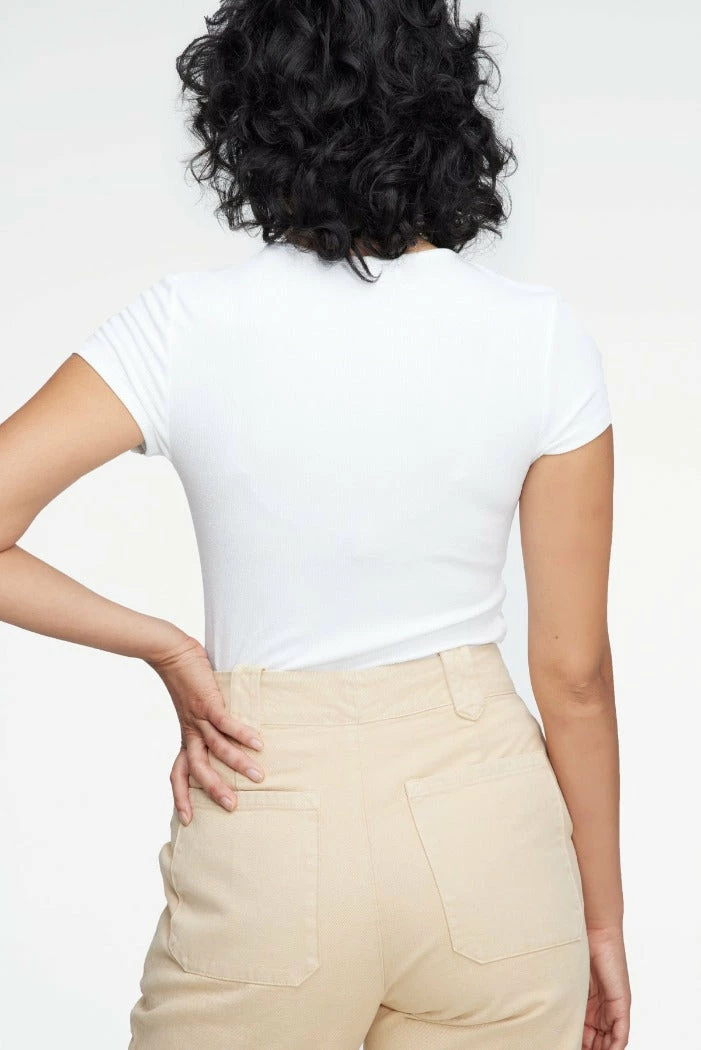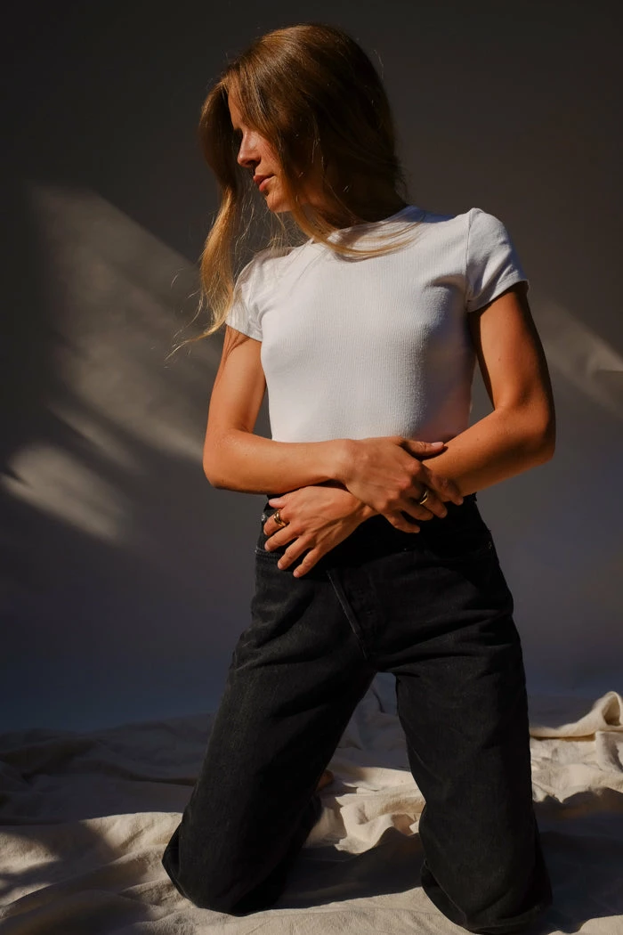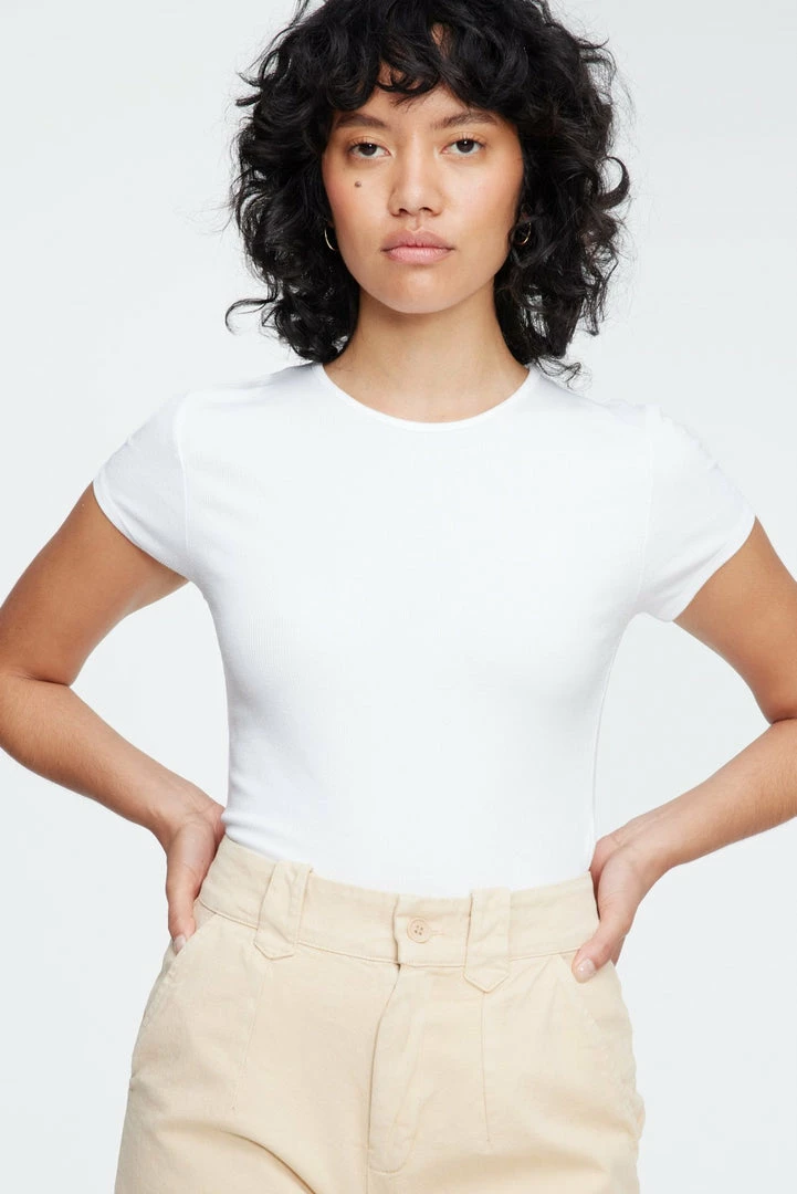 Lacausa Quincy ribbed baby tee in white. A fitted baby tee made from luxe 2×1 rib with a touch of spandex to for a snug, supportive fit! Siro spun micro modal is a semi-synthetic, plant-based fiber that is silky smooth to the touch.
