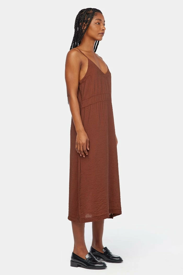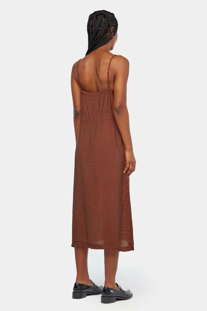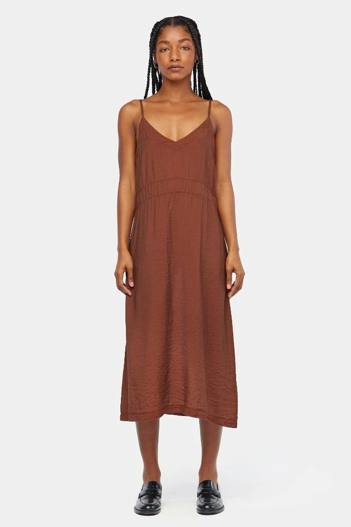 Lacausa Alma Slip Dress is a lightweight spaghetti strap slip dress in chocolate brown. Loose fit with v neckline. Crafted with crinkled fabric that makes the Alma great for layering or worn on its own. Complete the look with mules and oversized handbag.