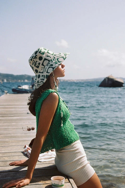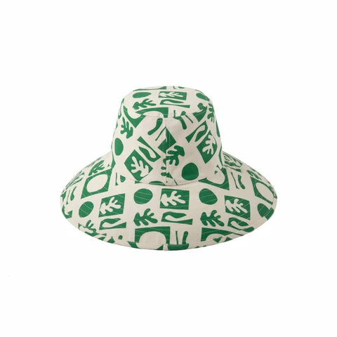 Lack of Color Holiday wide brimmed canvas bucket hat in formes green print. Finished with a neck tie to secure the hat to your head on all the adventures your day may bring you.