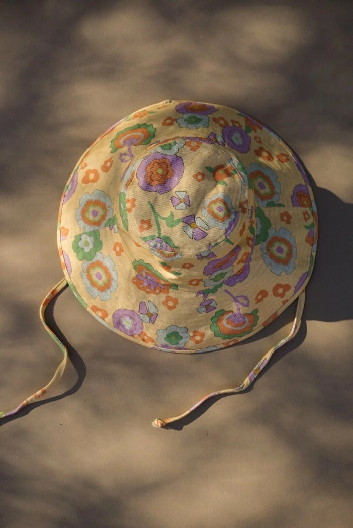 Lack of Color Holiday wide brimmed canvas bucket hat in retro floral print. Finished with a neck tie to secure the hat to your head on all the adventures your day may bring you.