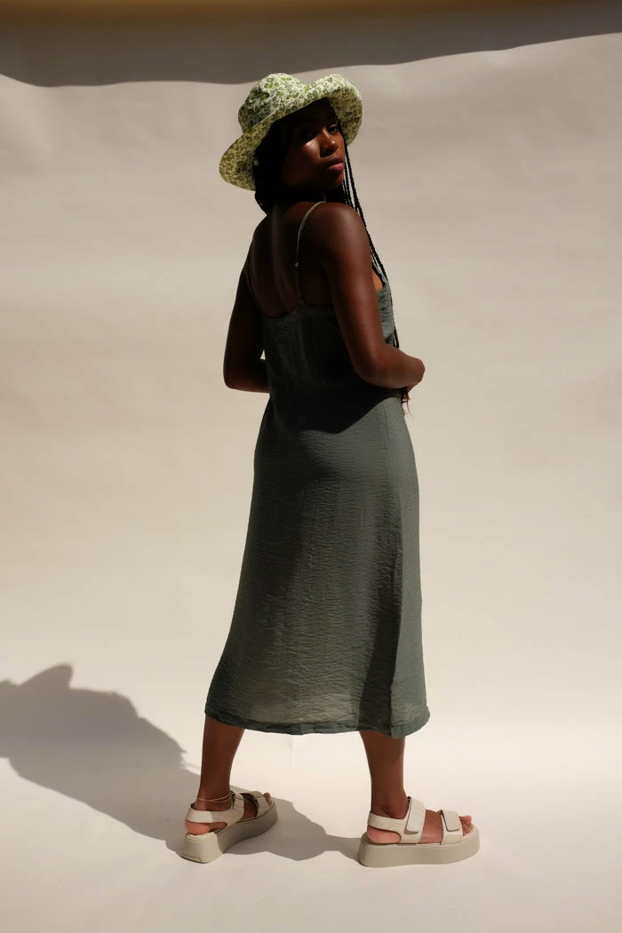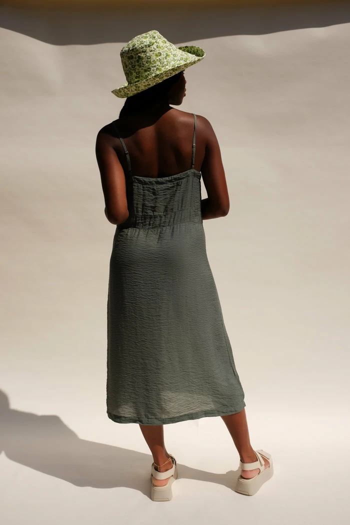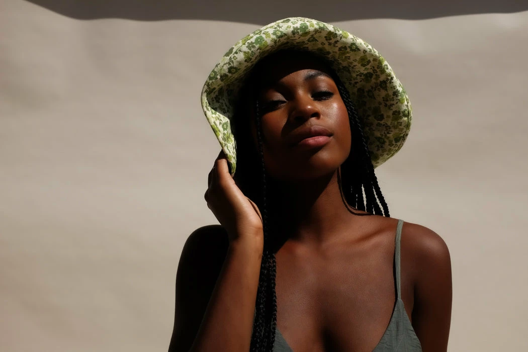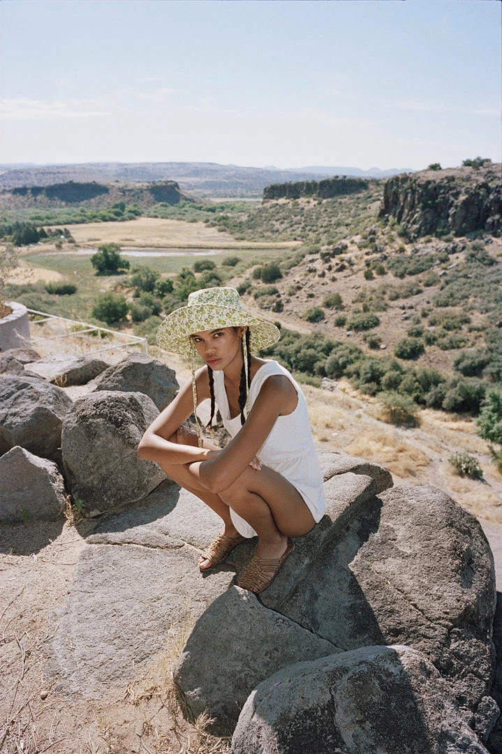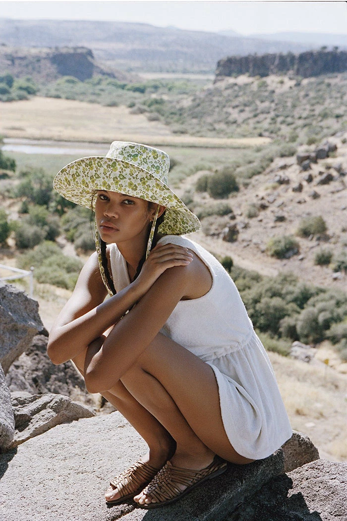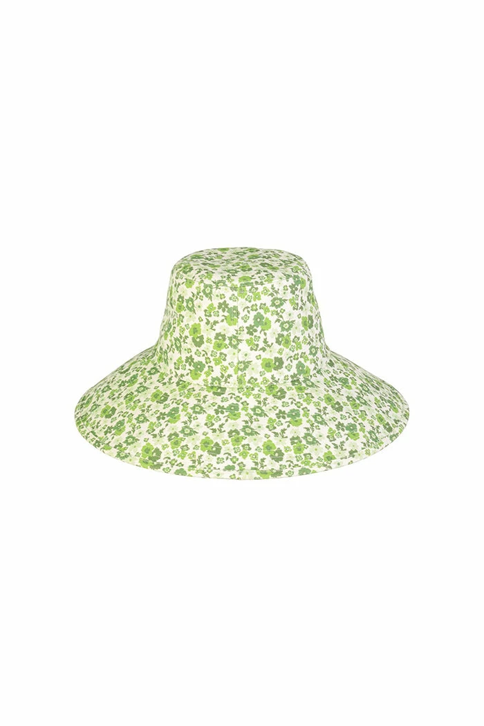 Lack of Color Holiday wide brimmed canvas bucket hat in ivy bloom green floral print. Finished with a neck tie to secure the hat to your head on all the adventures your day may bring you.