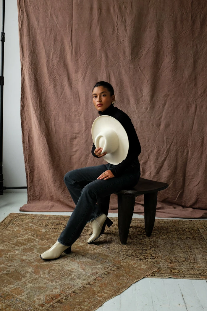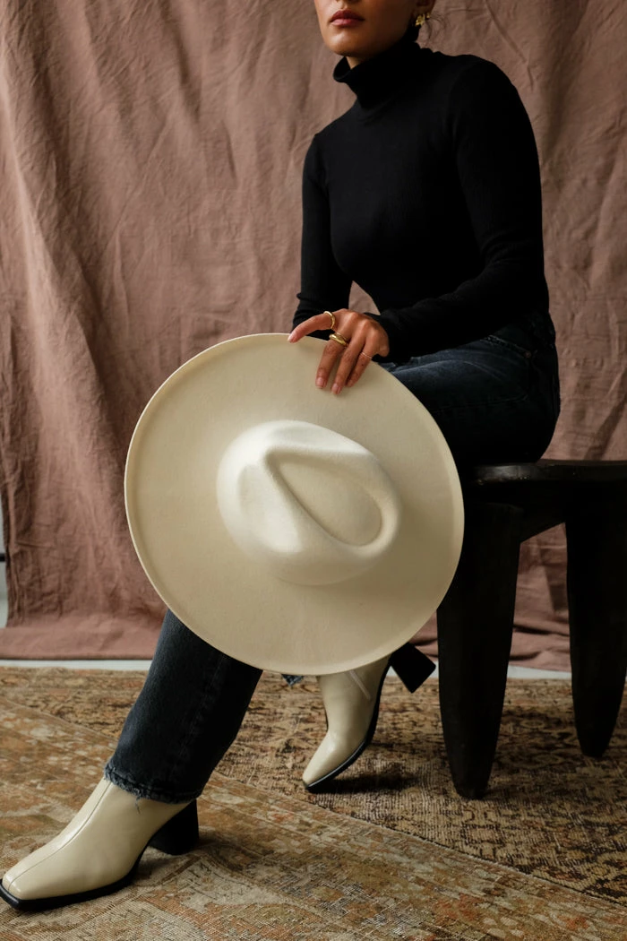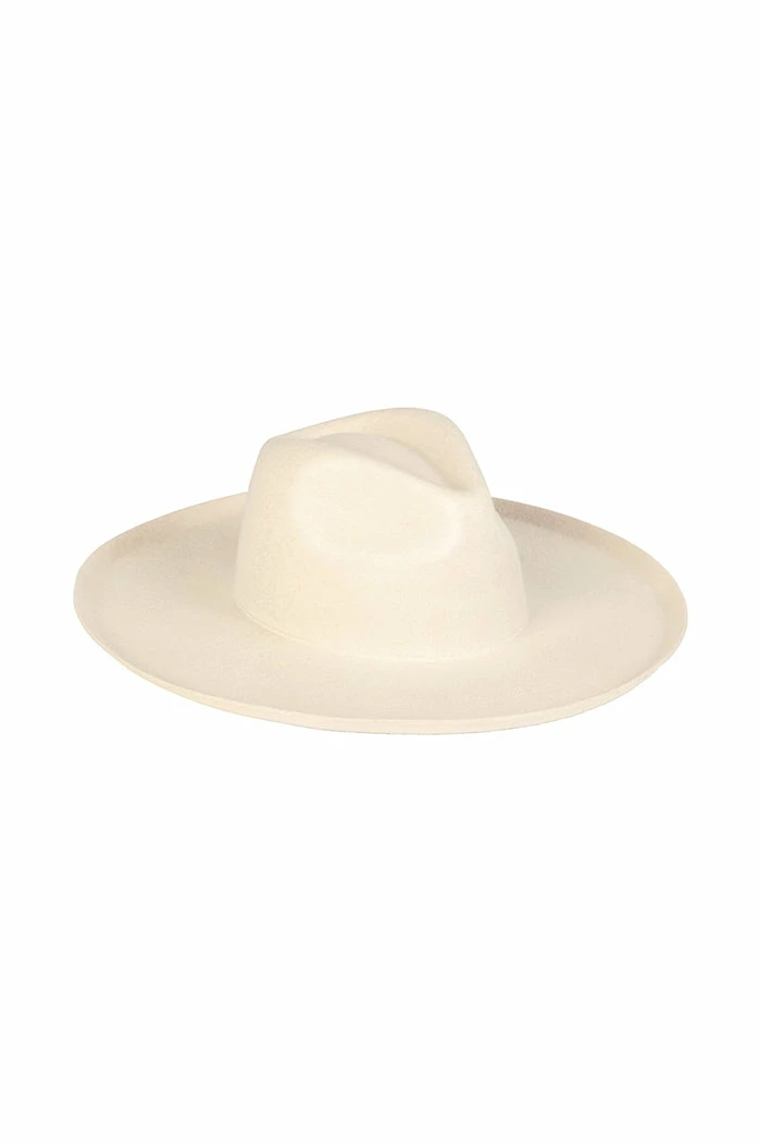Lack of Color plain and simple Melodic wool fedora in ivory. The first LOC hat with out a trim. Classic wide brimmed, firm fitting silhouette with flicked edge.Â