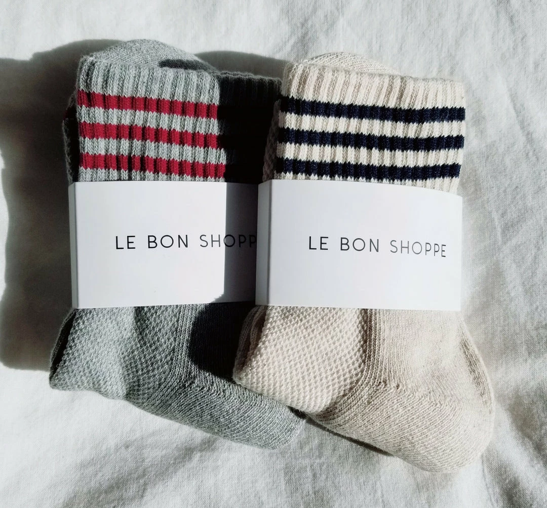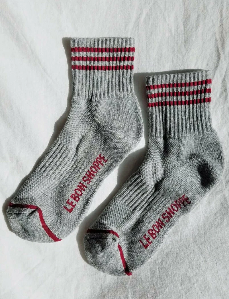 Le Bon Shoppe Girlfriend socks in heather grey with crimson red stripes. Crew version of one of our bestselling Boyfriend Socks!