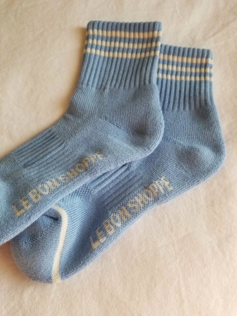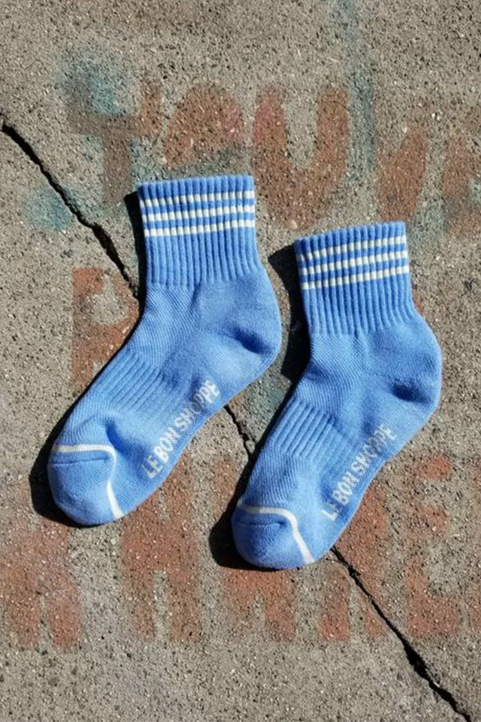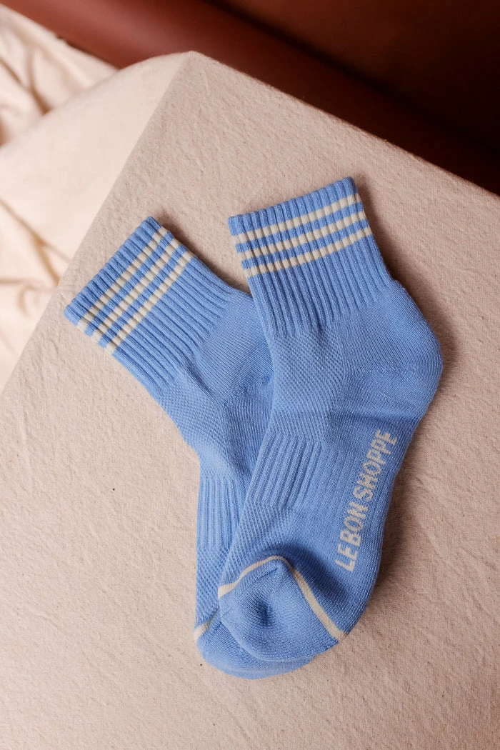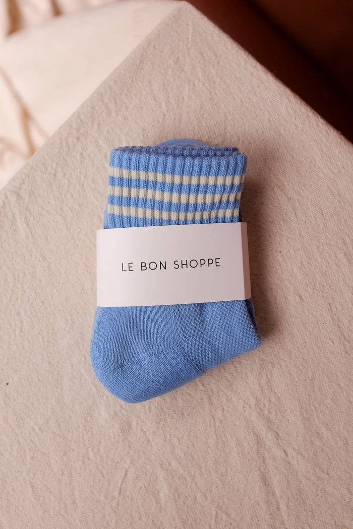 Le Bon Shoppe Girlfriend socks in parisian blue with ivory stripes. Crew version of one of our bestselling Boyfriend Socks!