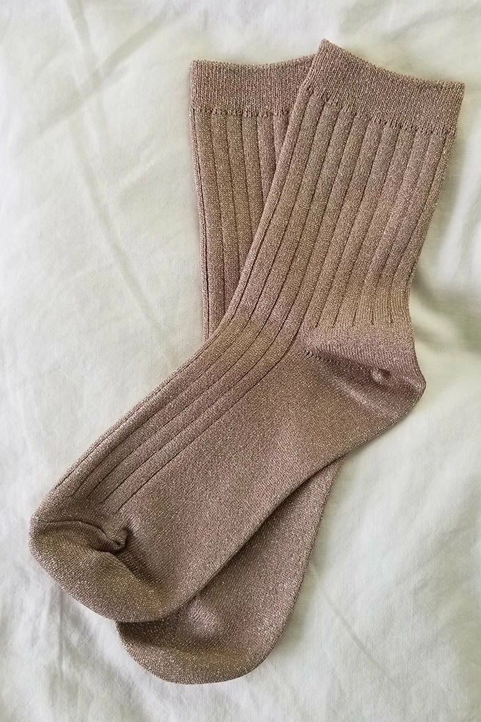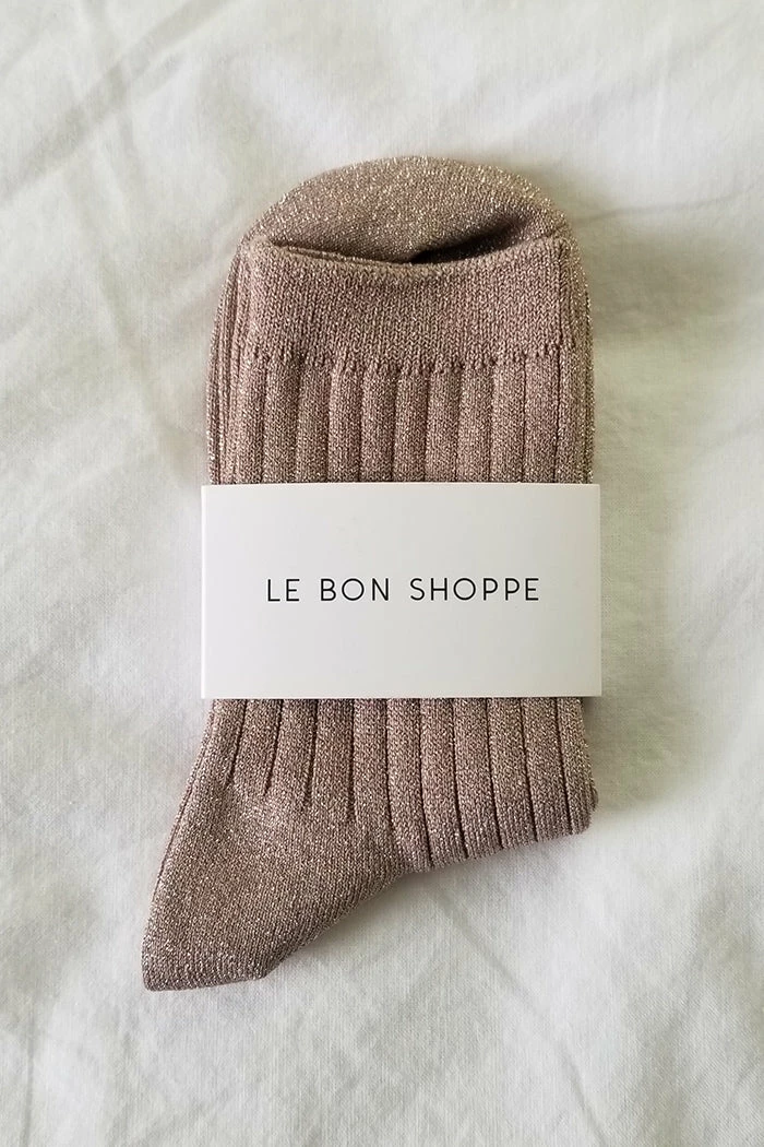 Le Bon Shoppe Her socks perfect height knit rib socks in glittery tan jute.