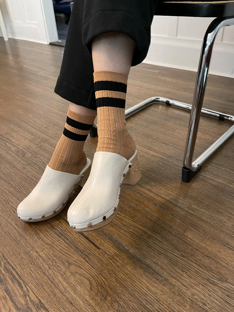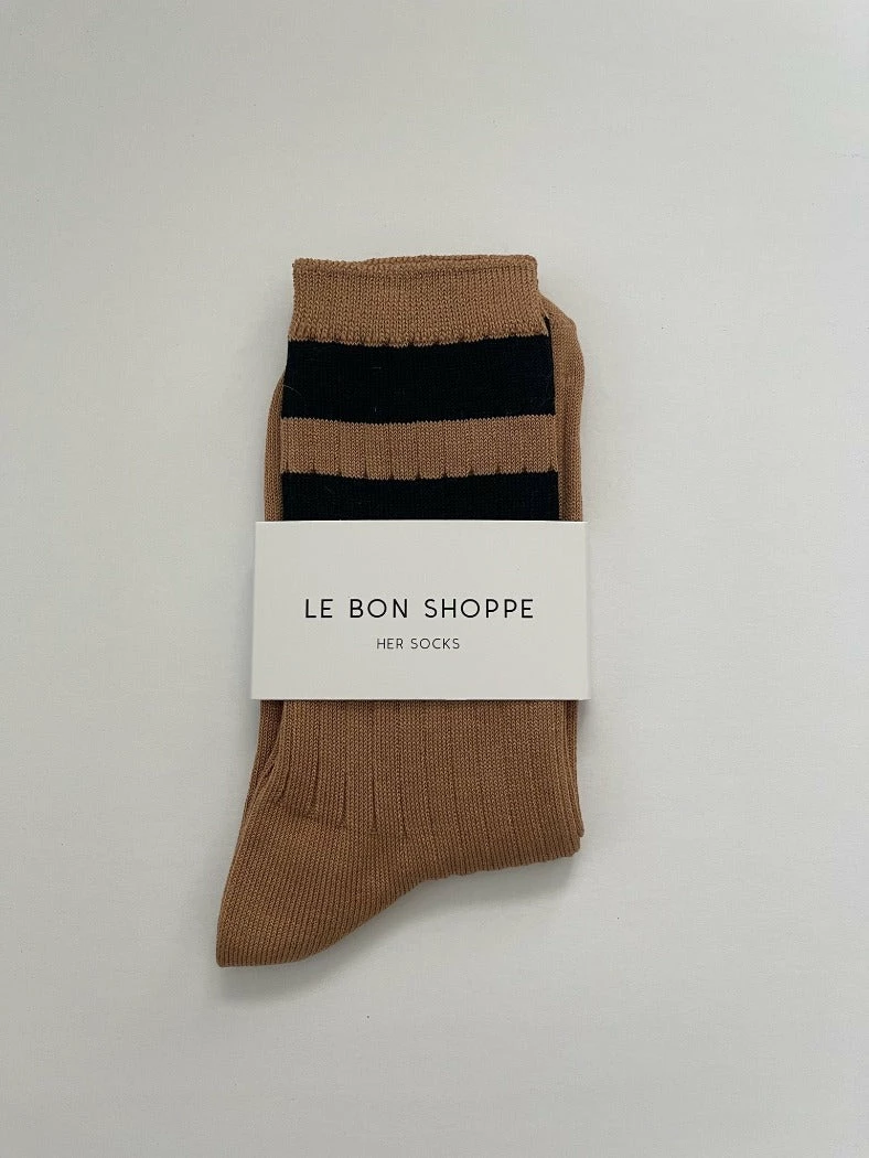 Le Bon Shoppe her varsity socks in peanut brown with black stripes. Bold stripe edition of her socks in mercerized combed cotton. The perfect height, knit rib socks.Â