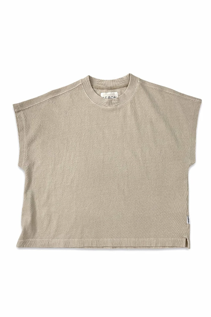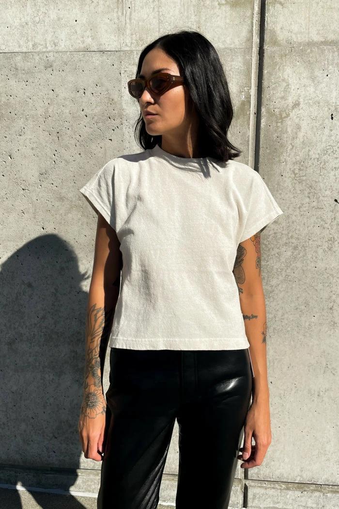 Le Bon Shoppe heavyweight 100% cotton urban muscle Jeanne tee in natural canvas color. This tee is garment dyed and pre-washed for a rich textured look with an ultra soft feel and a shorter length to pair perfectly with high waisted bottoms.