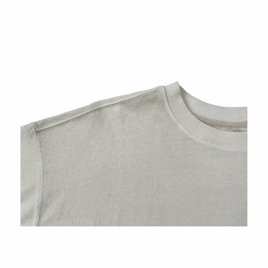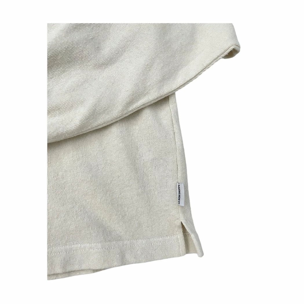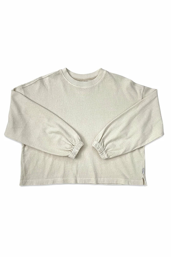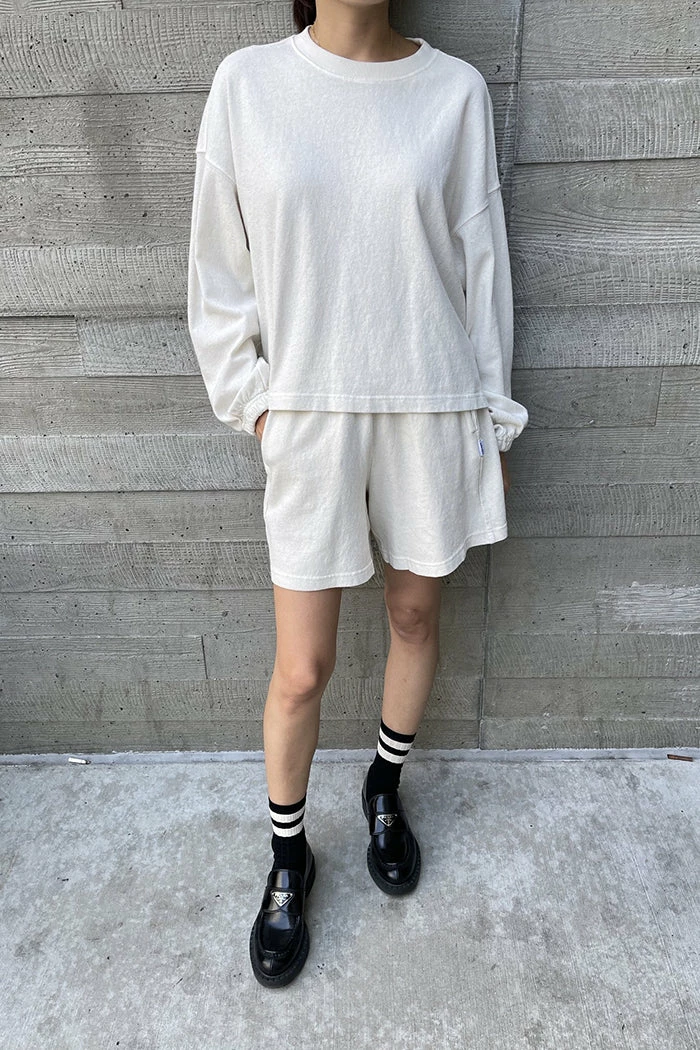 Le Bon Shoppe Naturelle long sleeve tee in alabaster. This fall essential long sleeve tee made in 100% cotton heavy weight low gauge knit. Super raw textured yet soft and airy. Elastic ruched sleeve opening creates a slight balloon sleeve effect worn down and scrunches up beautifully. Dropped shoulder dolman tee with a relaxed fit. This tee is garment dyed and pre-washed for a rich textured look with an ultra soft hand.