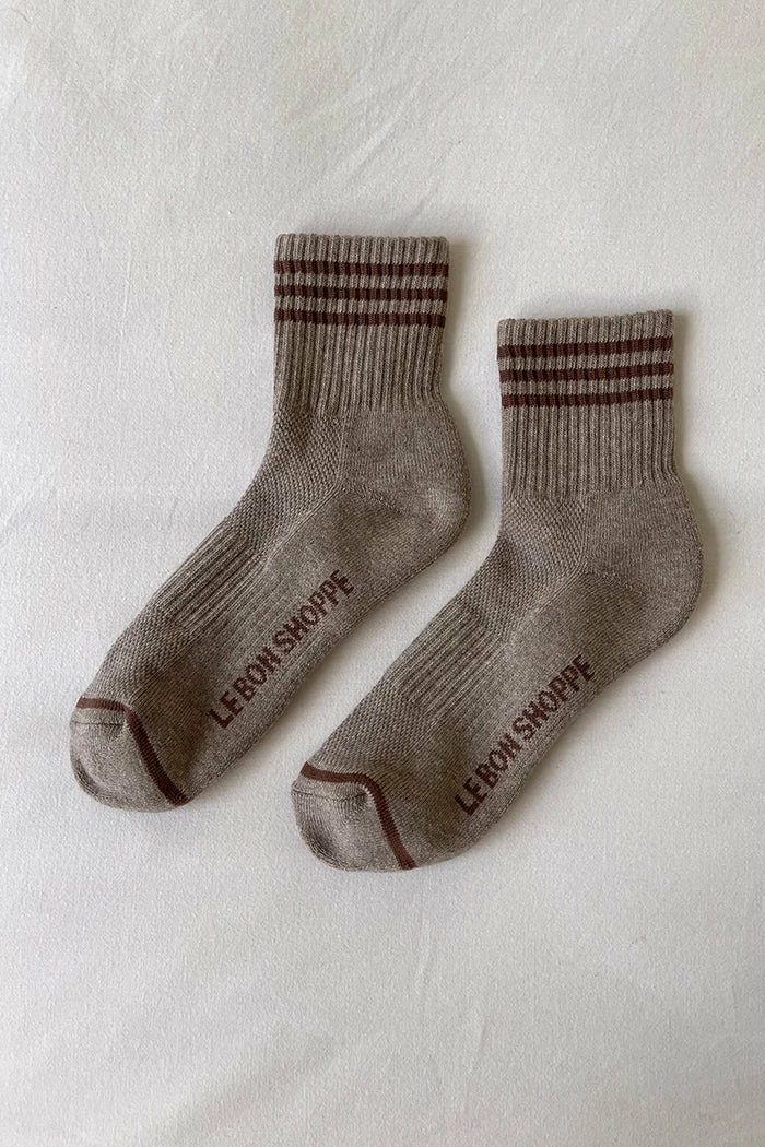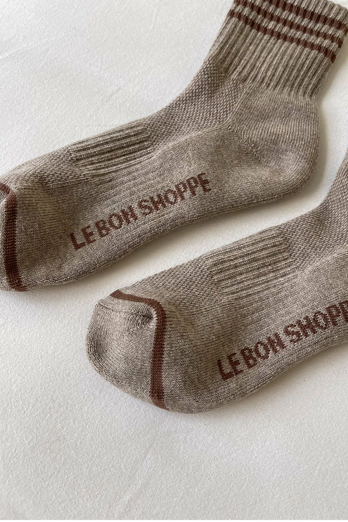 Le Bon Shoppe Girlfriend socks in hazelwood brown with dark brown stripes. Crew version of one of our bestselling Boyfriend Socks!