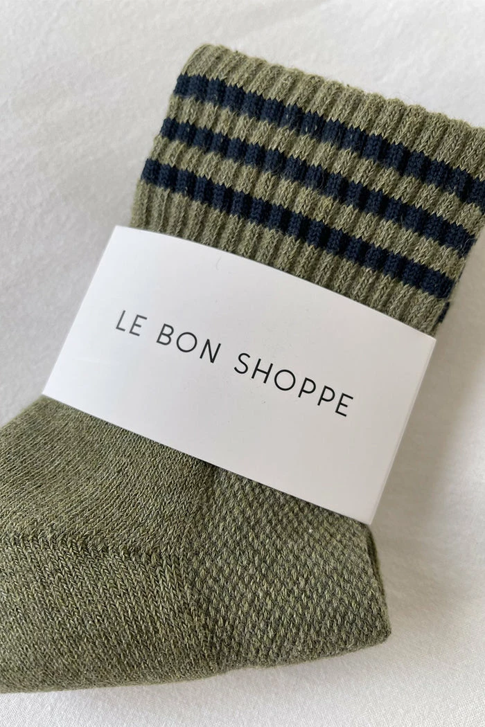 Le Bon Shoppe Girlfriend ribbed socks in heather sage green with navy blue stripes. Crew version of one of our bestselling Boyfriend Socks!