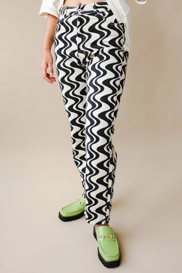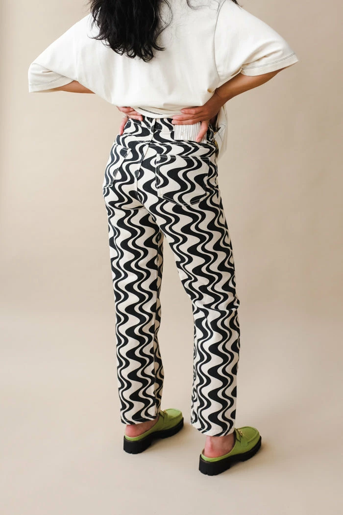 Mandinga Wave black and white printed denim jeans. Mid rise, zip fly, and straight leg.