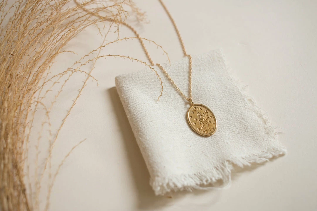 20” gold filled chain, 16mm x 22mm gold plated brass pendant.
