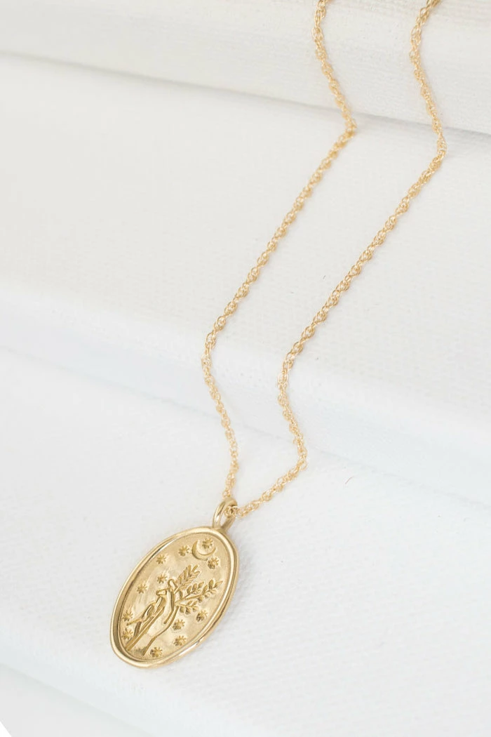 Merewif Diana gold engraved necklace. The artwork is based on roman goddess Diana, who was a roman goddess of the hunt & the moon, and had the power to talk to animals.