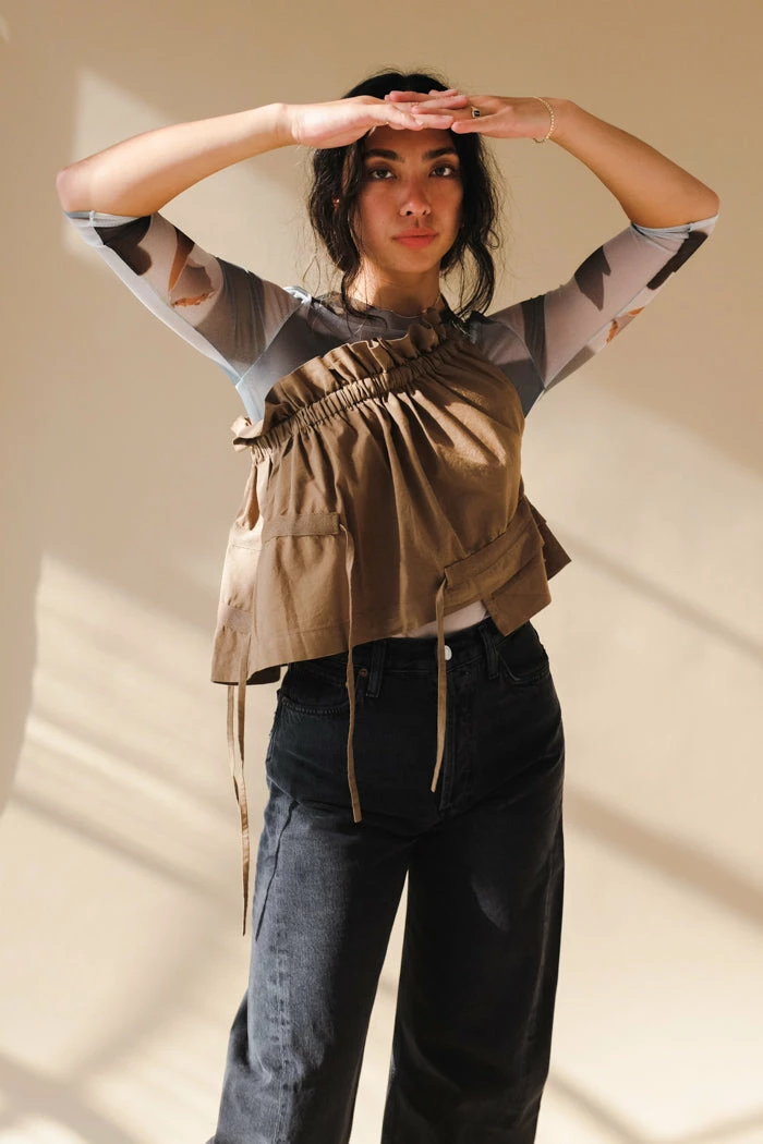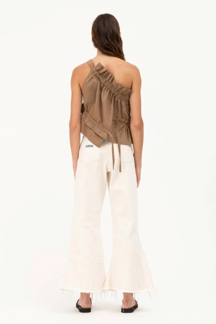 Mundaka Ruffle one shoulder top in taupe brown. Adjustable ties, to sinch the top in or make it more flowy.Â