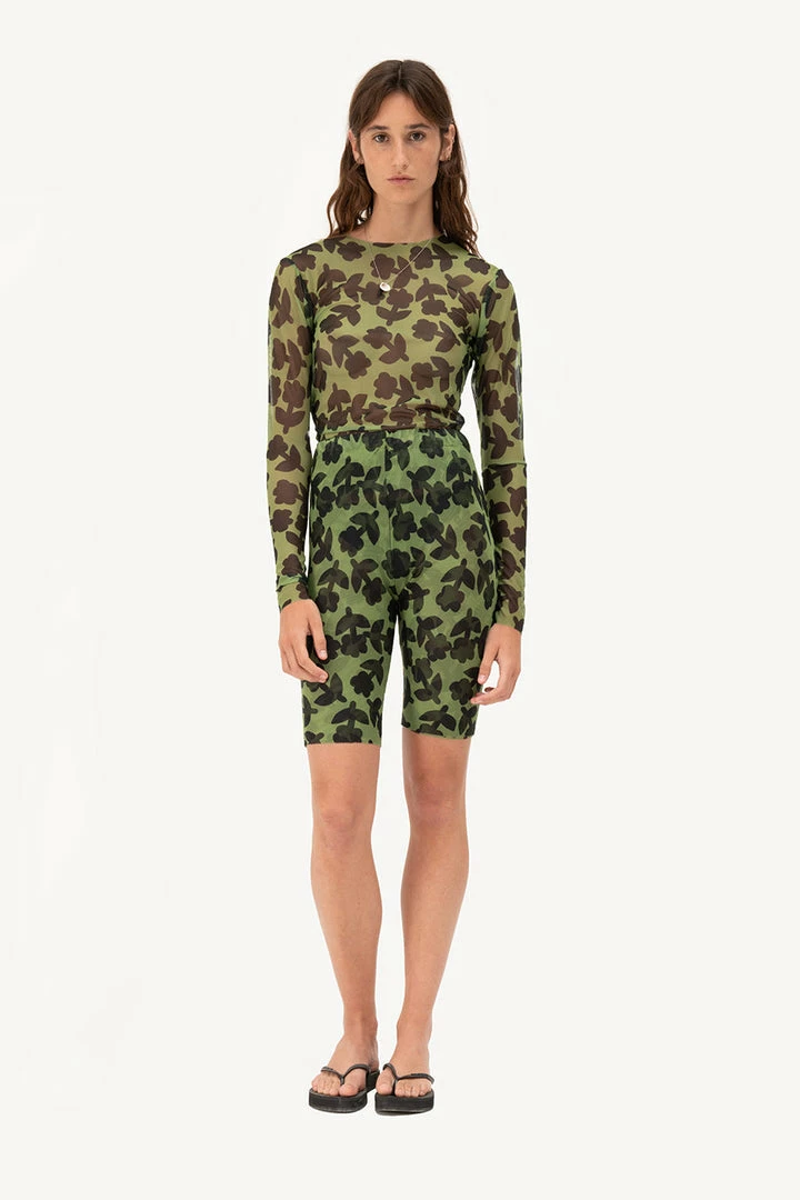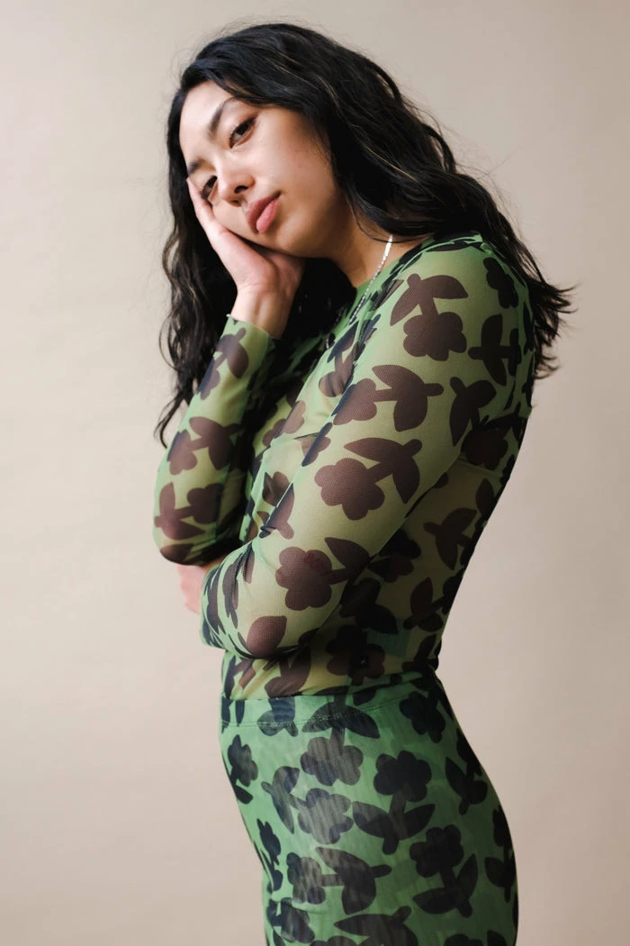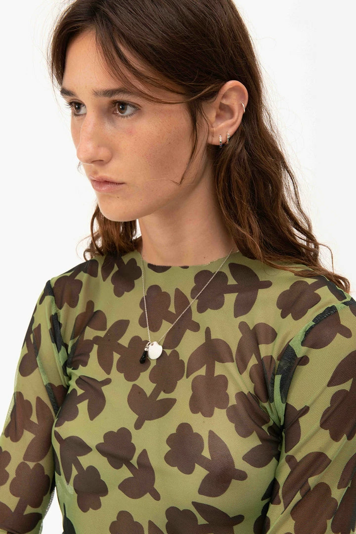 Mundaka Tulle long sleeve mesh floral top in green and black. Escape to the fun side, this floral printed tulle t-shirt has a close fit and classic crew line. With a silky touch, it has been printed with water based inks.