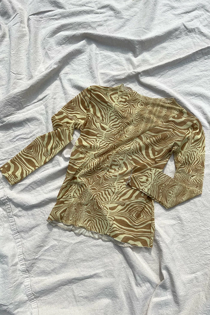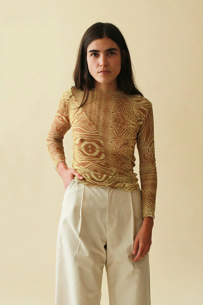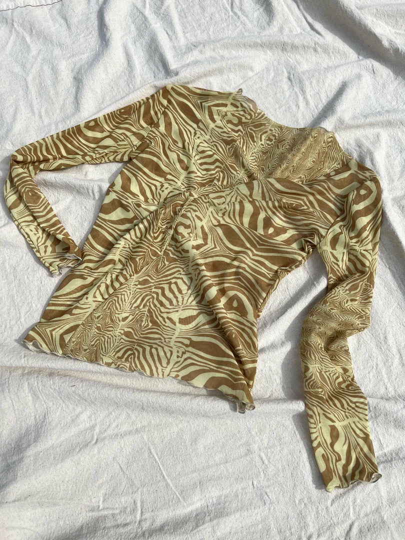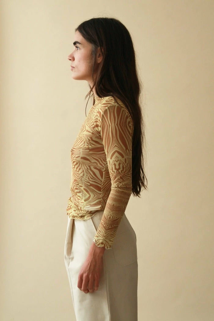 Nin Studios Swirl top in mesh hypnotic print. Lettuce hem.
