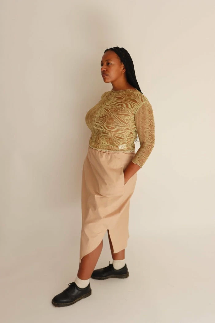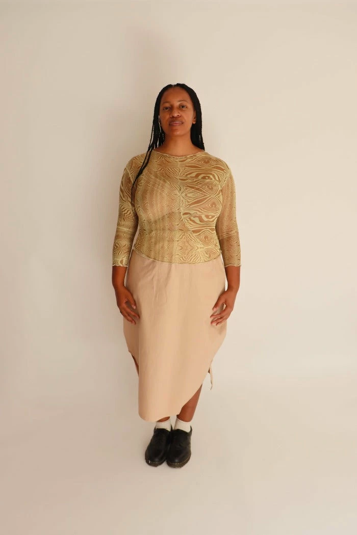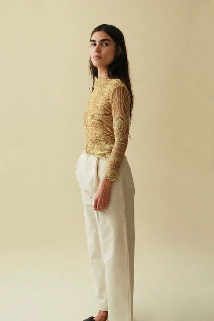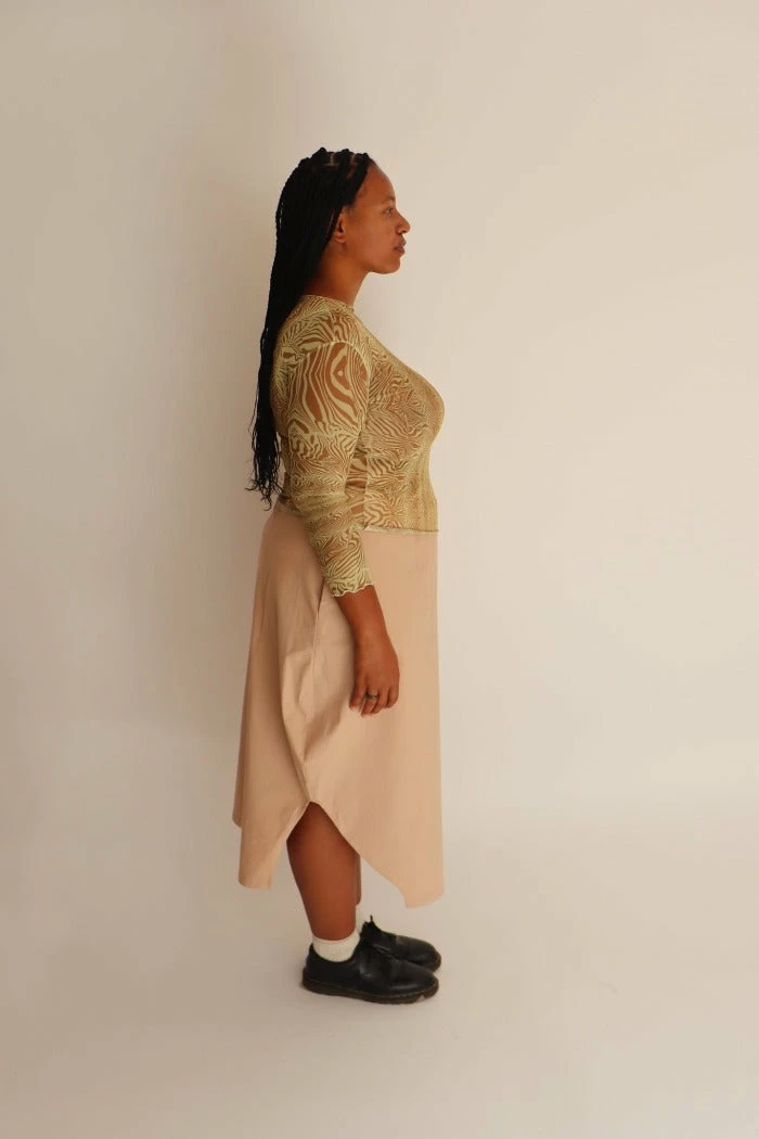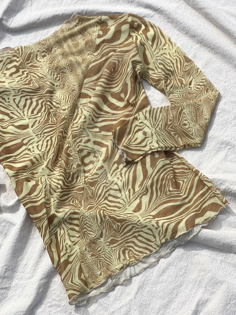 Nin Studios Swirl top in mesh hypnotic print. Lettuce hem.