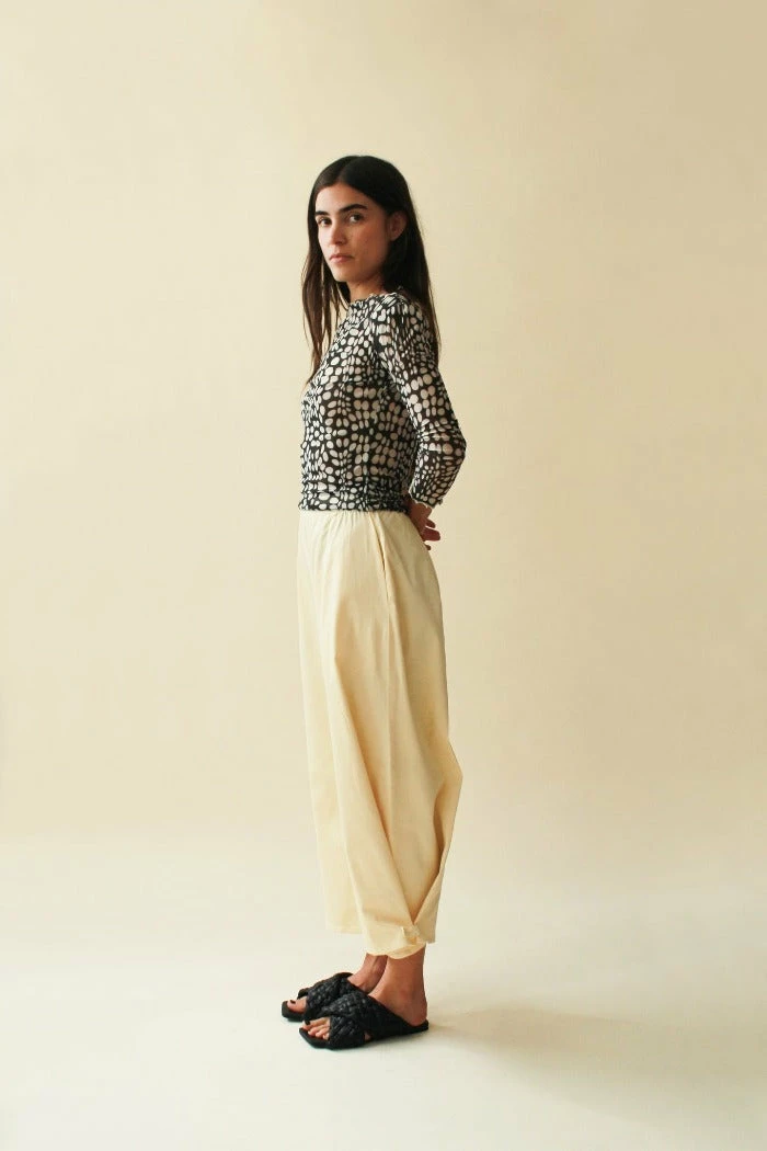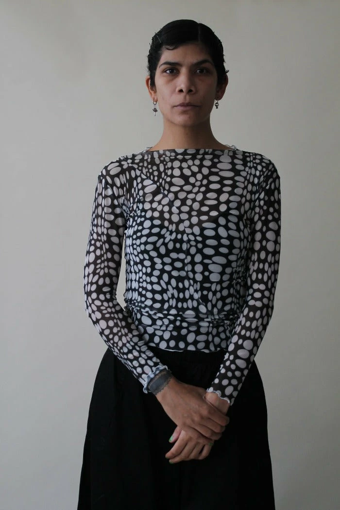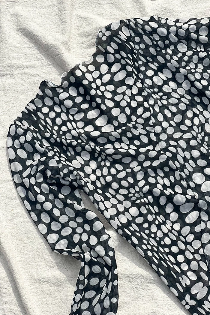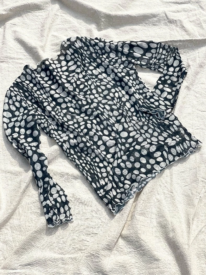 Nin Studio black cosmos Swirl mesh long sleeve top. Lettuce hem.Â